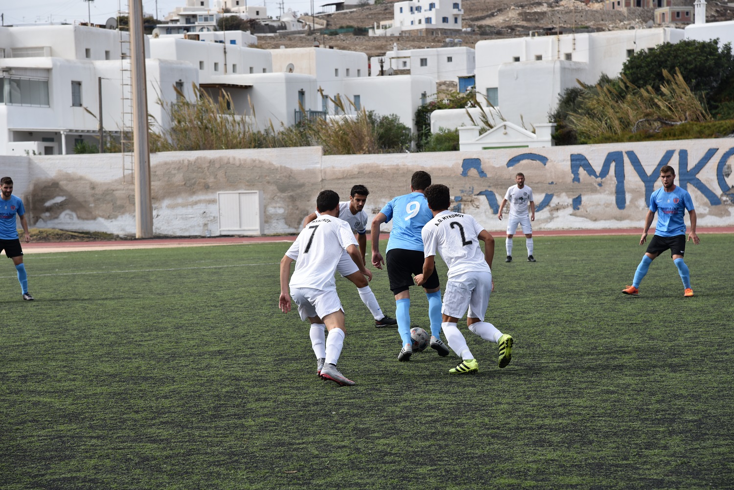 Από την άλλη ο Α.Ο. Σύρου συνέχισε τις μέτριες εμφανίσεις του, αφού στην Πάρο ουσιαστικά πέταξε ένα ολόκληρο ημίχρονο, πιστεύοντας ότι θα πάρει εύκολα το παιχνίδι. Η ομάδα της Πάρου που έδειξε πείσμα και χαρακτήρα προηγήθηκε στο σκορ και μάλιστα όταν βρέθηκε πίσω με 1-2 έχασε καλή ευκαιρία να φέρει το ματς στα ίσα. Το τεχνικό δίδυμο των Συριανών όλη τη βδομάδα δούλεψε ενόψει Μυκόνου, καθώς γνωρίζει πως με τέτοια εμφάνιση δεν μπορεί να κερδίσει τους επίδοξους πρωταθλητές.