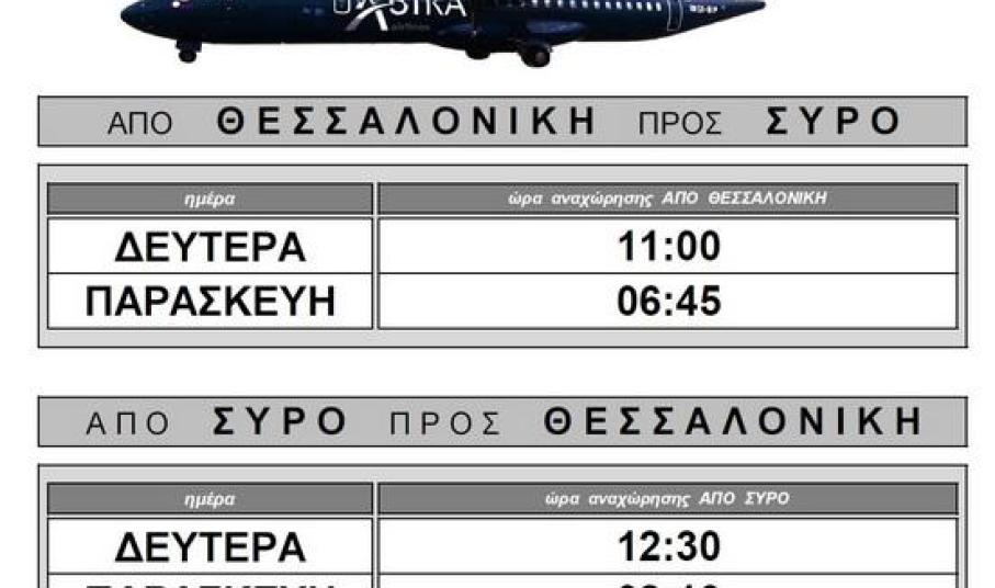 Συγκεκριμένα, η Astra Airlines έχει προγραμματίσει την εκτέλεση των δρομολογίων της για τη Σύρο δύο φορές την εβδομάδα με σκοπό την εξυπηρέτηση του νησιού και τη στήριξή του, ως προορισμού του Σαββατοκύριακου. Οι πτήσεις από Θεσσαλονίκη προς Σύρο κάθε Δευτέρα έχουν ώρα αναχώρησης στις 11.00 και την Παρασκευή στις 06.45 το πρωί, καθώς επίσης από Σύρο με προορισμό τη Θεσσαλονίκη, κάθε Δευτέρα στις 12.30 και την Παρασκευή στις 08.10 το πρωί. Συνολικά η διάρκεια του ταξιδιού συμπληρώνει μία ώρα και δέκα λεπτά.
