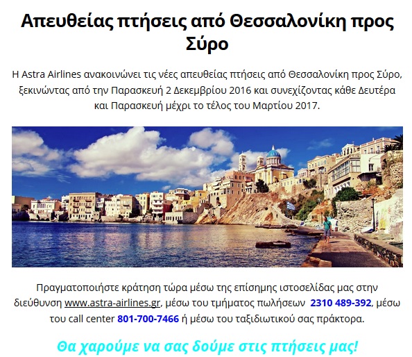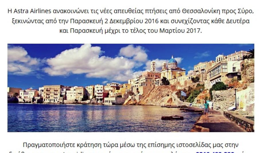 Τη δυνατότητα απευθείας αεροπορικής σύνδεσης με τη Θεσσαλονίκη κατά τη χειμερινή περίοδο θα έχει επισήμως η Σύρος από τις 2 Δεκεμβρίου, μετά και τη γνωστοποίηση των προγραμματισμένων πτήσεων δύο φορές την εβδομάδα, εκ μέρους της αεροπορικής εταιρείας, Astra Airlines.