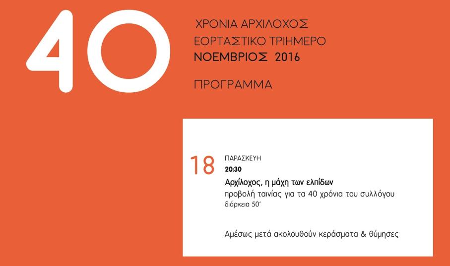 Σας καλούμε σε ένα εορταστικό τριήμερο που θα ξεκινήσει την Παρασκευή 18 Νοεμβρίου, στις 20:30 με την προβολή του ντοκιμαντέρ «Αρχίλοχος, η μάχη των ελπίδων», αφιέρωμα στα 40 χρόνια πολιτιστικής δραστηριότητας του.