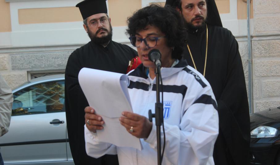 «Σε τούτο εδώ τον τόπο τον μέγα, το μικρό, έχουν μάθει από χρόνια οι υπηρέτες να υπηρετούνται και όλοι μαζί να τους προσκυνούνε. Μιλούν χωρίς να ακούν, χαιρετούν δίχως να βλέπουν, πράττοντας πάντα κατά τις υποδείξεις. Κι εμείς οι άλλοι οι μικροί μάθαμε να σιωπούμε, μα μη ξεχνούμε πως η ιστορία γράφεται με πράξεις, θυσίες και όχι με λόγια, μόνο με αγώνες. Πολλές φορές με αίμα. Έτσι γεννιούνται μνήμες, αυτή την προίκα και κληρονομιά αφήνουμε εις τους αιώνες. Ας μάθουμε λοιπόν στους νέους να παλεύουν όχι μόνο για το βόλεμα, για την πατρίδα μόνο κι αυτή η έρημη πατρίδα χάνεται γιατί δεν την υπηρετούμε, δεν μας αξίζει, την πουλάμε και μόνοι μας λογομαχούμε. Αντίσταση πρέπει να μάθουμε στους νέους, στα παιδιά μας, και όχι να περπατούν σκυφτά και ντροπιασμένα, αλλά μόνο καμαρωτά, υπερήφανα, καθώς θα το αξίζουν» σημείωσε στον λόγο της η κ. Λακαταμίτου.