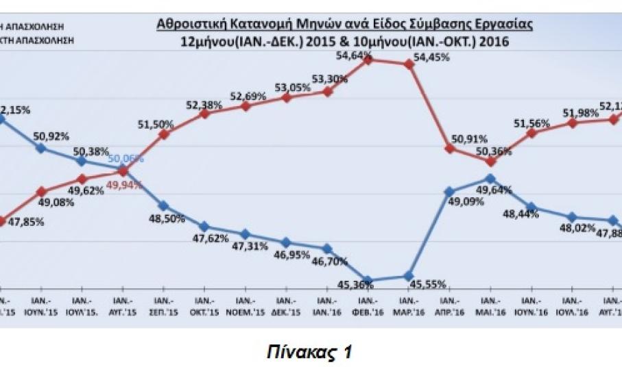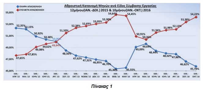 Πιο συγκεκριμένα, στο ξεκίνημα του 2015 η πλήρης απασχόληση κυριαρχούσε με ποσοστό 52,35% έναντι των ευέλικτων μορφών απασχόλησης με 47,65%. Σήμερα, 2 χρόνια μετά υπάρχει πλήρης ανατροπή στην αγορά εργασίας με τις ευέλικτες μορφές απασχόλησης να είναι πλέον κυρίαρχες με ποσοστό 54,22% έναντι 45,78% της πλήρους απασχόλησης (Πίνακας 1).