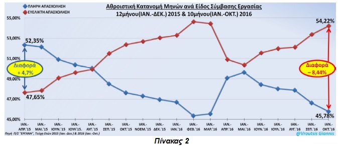 Σήμερα, τα στοιχεία του συστήματος “ΕΡΓΑΝΗ” για το ισοζύγιο των ροών μισθωτής απασχόλησης είναι εξόχως αποκαλυπτικά και ανησυχητικά για τις μετέπειτα εξελίξεις στην αγορά εργασίας, καθώς η διαφορά μεταξύ της πλήρους και ευέλικτης απασχόλησης διαμορφώθηκε από το +4,7% (Ιαν.-Απρ. 2015) στο – 8,44% σήμερα (Πίνακας 2).