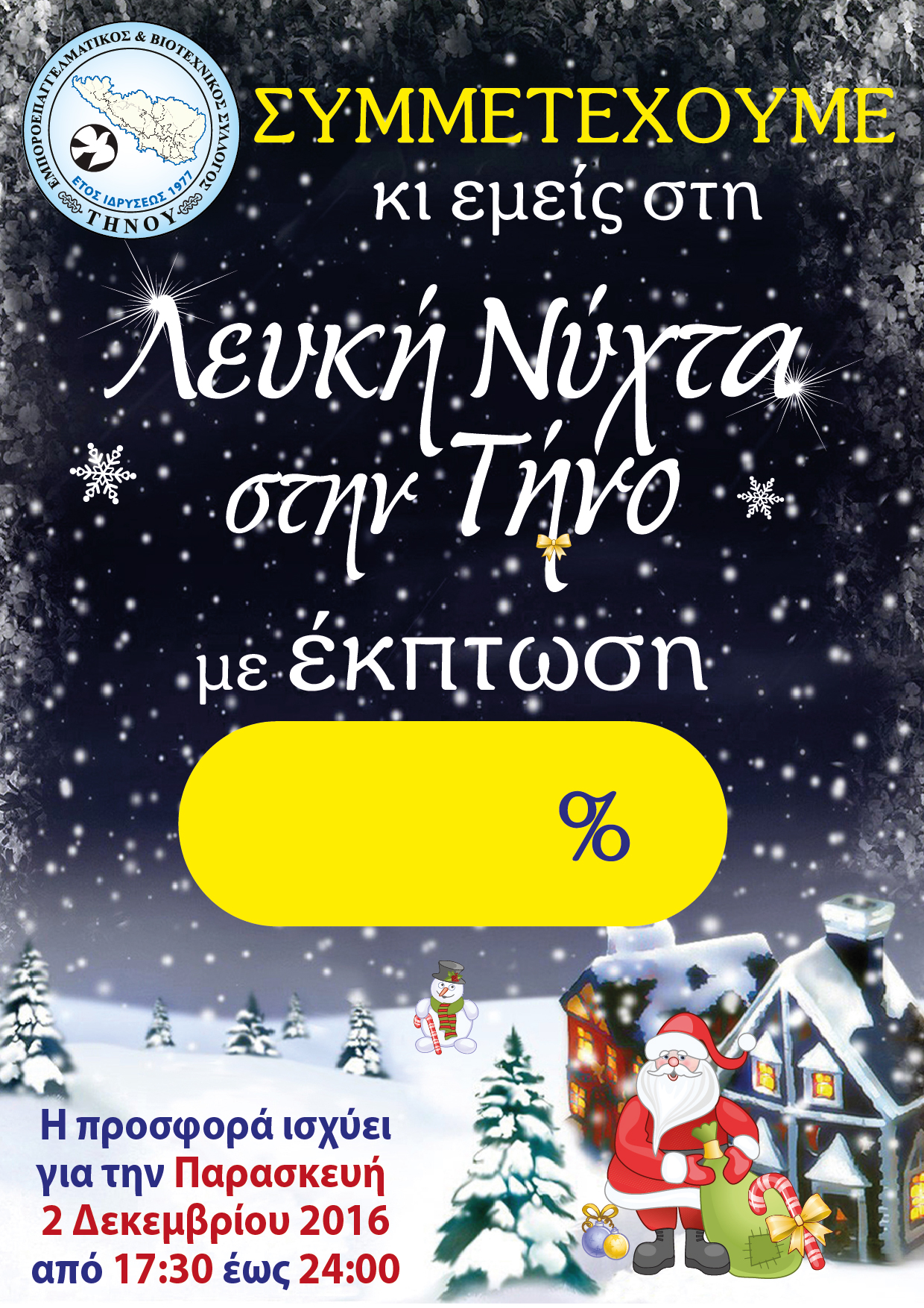 Την Παρασκευή 2 Δεκεμβρίου 2016 τα καταστήματα θα είναι ανοιχτά μέχρι τις 24:00 τα μεσάνυχτα. Από τις 17:30 και μέχρι τις 24:00 τα καταστήματα που θα συμμετέχουν στη ‘’Λευκή Νύχτα’’ θα κάνουν προσφορές στα προϊόντα τους.