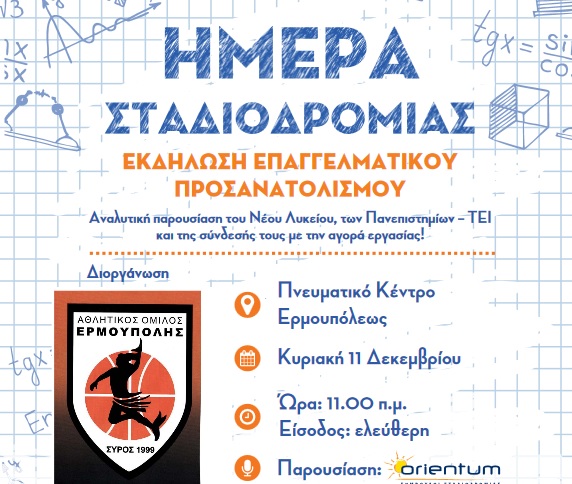 Ο Αθλητικός Όμιλος Ερμούπολης διοργανώνει την Κυριακή 11 Δεκεμβρίου στο Πνευματικό Κέντρο Ερμούπολης εκδήλωση επαγγελματικού προσανατολισμού, όπου θα γίνει αναλυτική παρουσίαση του Νέου Λυκείου, των Πανεπιστημίων - ΤΕΙ και της σύνδεσής τους με την αγορά εργασίας.