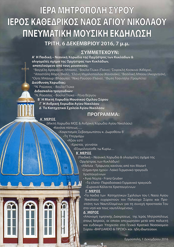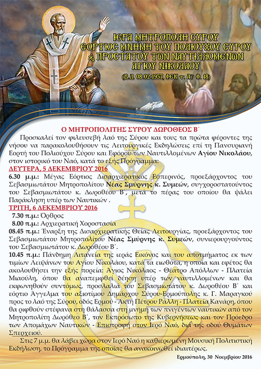 Το πρόγραμμα των εορταστικών εκδηλώσεων για τον Πολιούχο της πόλης, Άγιο Νικόλαο στις 6 Δεκεμβρίου γνωστοποιεί η Ιερά Μητρόπολη Σύρου μέσω του επισυναπτόμενου αρχείου.