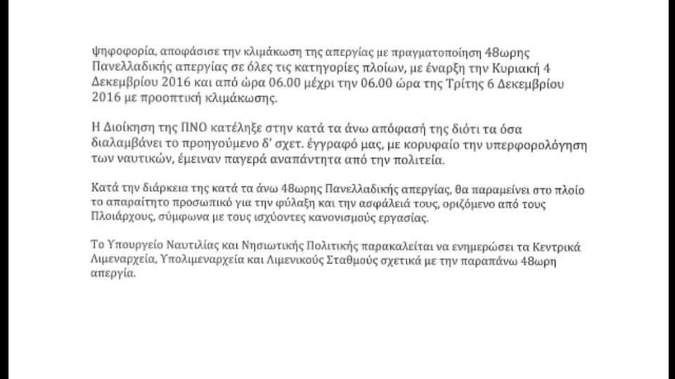 H Διοίκηση της Πανελλήνιας Ναυτικής Ομοσπονδίας, στην συνέχεια του από 29 Δεκεμβρίου 2016 δελτίου τύπου με το οποίο και ανακοίνωνε την απόφασή της για την πραγματοποίηση πανελλαδικής 48ωρης προειδοποιητικής απεργίας, για τα φλέγοντα θέματα που απασχολούν τον κλάδο των ναυτικών με προεξάρχοντα τα θέματα του ασφαλιστικού και φορολογικού, σε όλες τις κατηγορίες πλοίων με προοπτική κλιμάκωσης, κατά την σημερινή συνεδρίασή της, και αφού έλαβε υπόψη της την αδιάλλακτη και ανυποχώρητη θέση της Κυβέρνησης, αποφάσισε να κλιμακώσει τον αγώνα της με την πραγματοποίηση νέας 48ωρης πανελλαδικής απεργίας για όλες τις κατηγορίες πλοίων που θα αρχίζει την 06.01 ώρα της 4 Δεκεμβρίου 2016 ημέρα Κυριακή και θα λήγει την 6 Δεκεμβρίου 06.00 ημέρα Τρίτη και ώρα 06:00, με προοπτική κλιμάκωσης, οπότε και ΟΛΑ ΤΑ ΠΛΟΙΑ ΘΑ ΠΑΡΑΜΕΙΝΟΥΝ ΜΕ ΔΕΜΕΝΟΥΣ ΚΑΒΟΥΣ και δεν θα εκτελεστεί κανένα να δρομολόγιο.