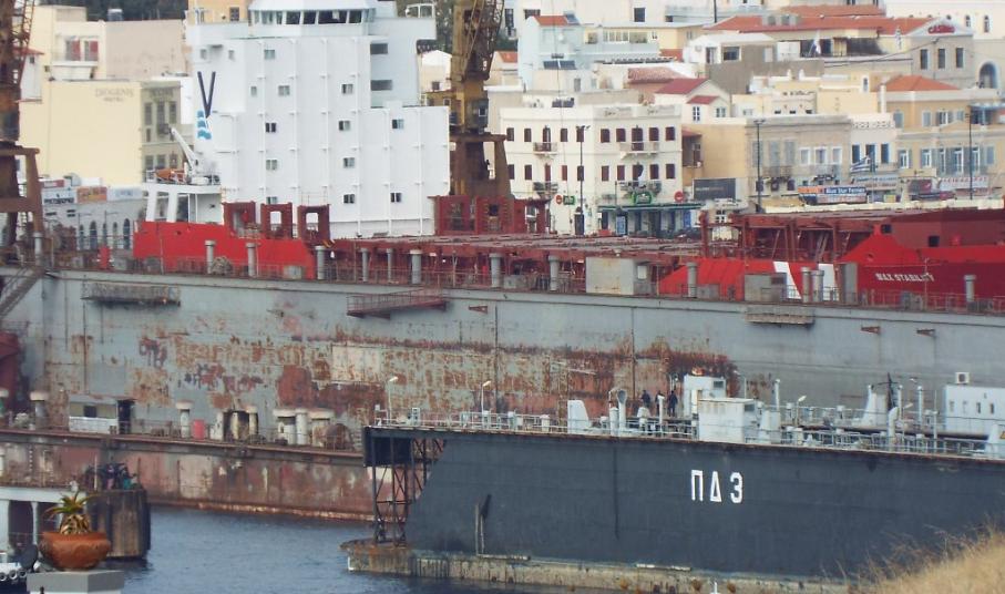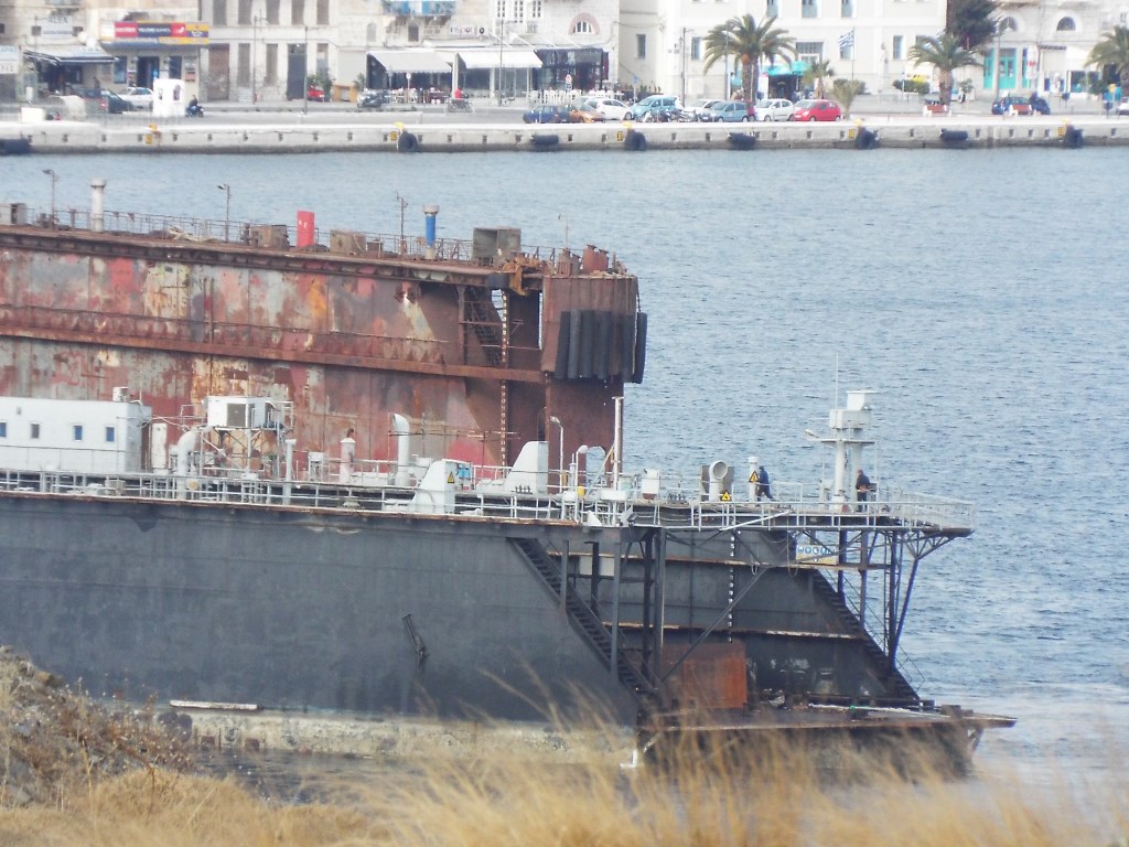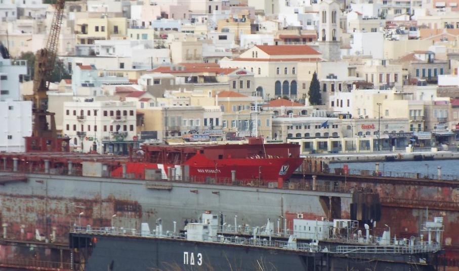 Πρόκειται για τη δεξαμενή που ανέμεναν οι εργαζόμενοι του Νεωρίου με σκοπό να εκτελέσουν τις απαραίτητες εργασίες δεξαμενισμού κι επισκευής της, με την άφιξή της σήμερα στη Σύρο να “χαρίζει” μία μικρή και προσωρινή οικονομική ανάσα προς τους ίδιους.