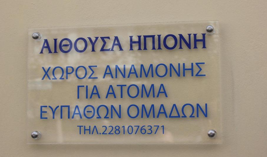 Η αίθουσα αναμονής για άτομα ευπαθών ομάδων με το όνομα «Ηπιόνη» -σύζυγος του Θεού της Ιατρικής, Ασκληπιού- εγκαινιάστηκε χθες το πρωί από το Λιμενικό Ταμείο Σύρου, παρουσία του Δημάρχου Σύρου Γιώργου Μαραγκού, του Αντιπεριφερειάρχη Κυκλάδων Γιώργου Λεονταρίτη και εκπροσώπων της τοπικής αυτοδιοίκησης.