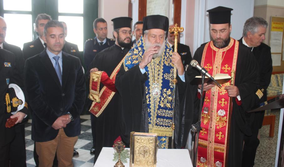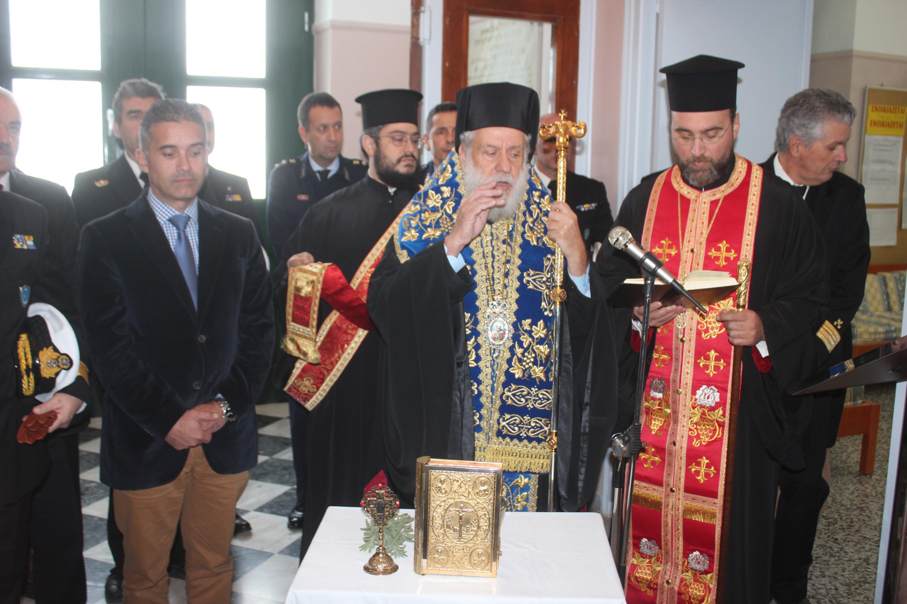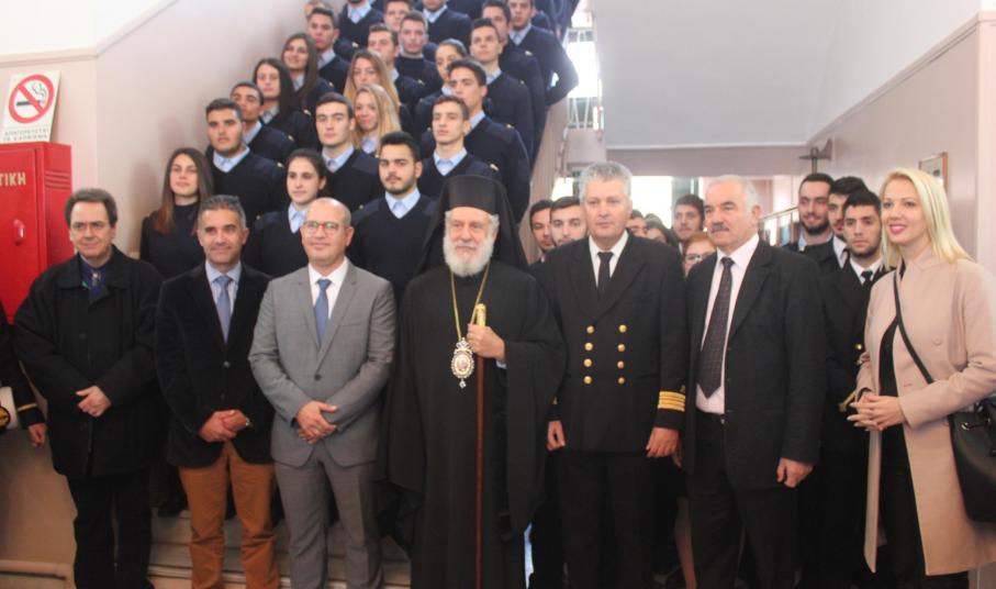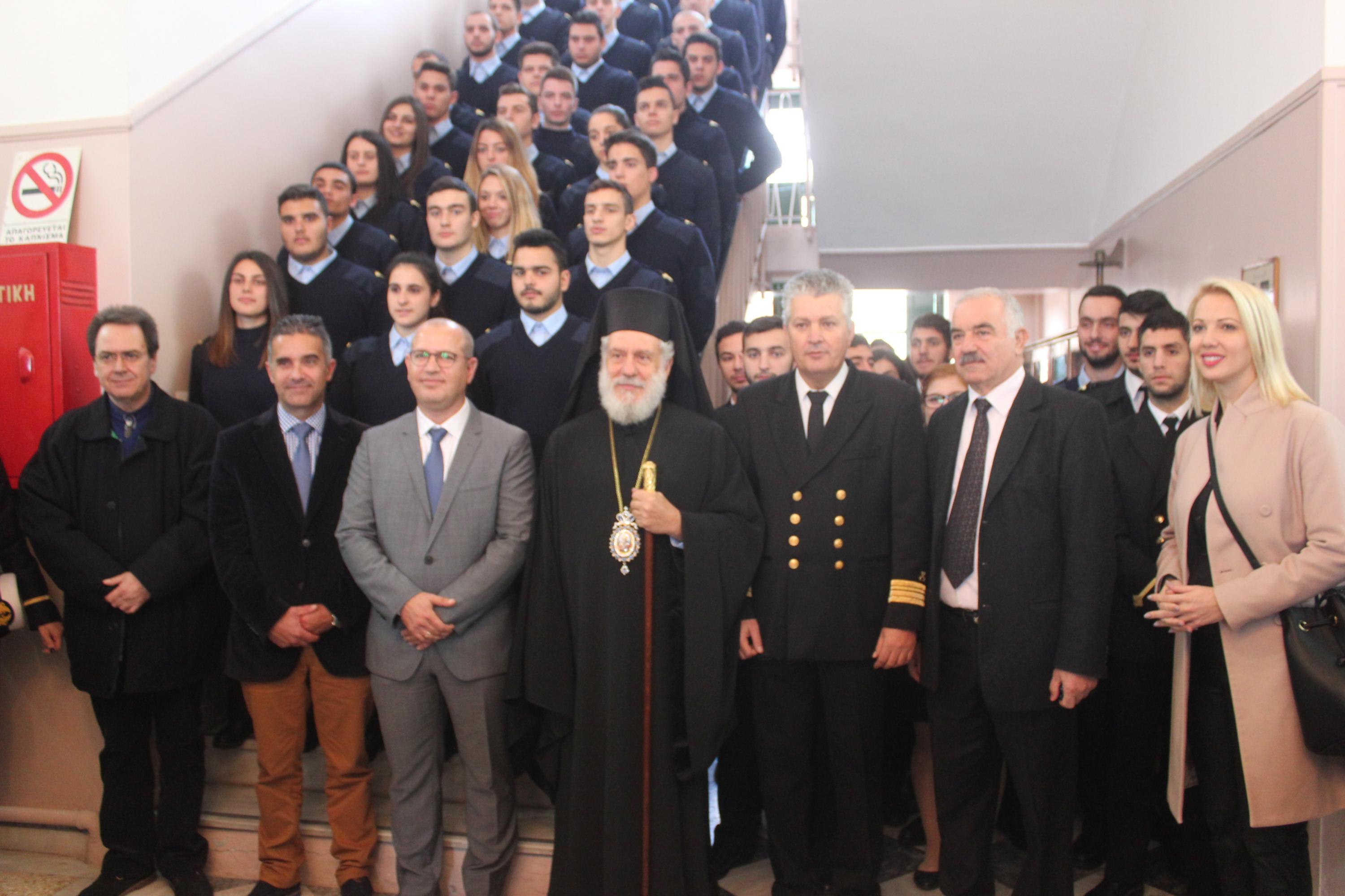 Τον αγιασμό για τη νέα διδακτική χρονιά τέλεσε ο Σεβασμιώτατος Μητροπολίτης Σύρου κ. Δωρόθεος Β’, ευχόμενος στους σπουδαστές να συνεχίσουν την ένδοξη ναυτική παράδοση της Ελλάδας, μιας χώρας που καυχιέται για τον ουρανό της, τις γαλάζιες θάλασσες της και τα υπερήφανα παιδιά της, τα όνειρα των οποίων δεν θα πρέπει να επιτρέψουμε σε κανέναν να τα ψαλιδίσει. Ο κ. Δωρόθεος δεν παρέλειψε να αναφερθεί στην αγαστή συνεργασία του με τον προηγούμενο διοικητή της Σχολής Νικόλαο Πολέμη, ευχόμενος καλή επιτυχία στα νέα του καθήκοντα στο κεντρικό Λιμεναρχείο του Πειραιά.
