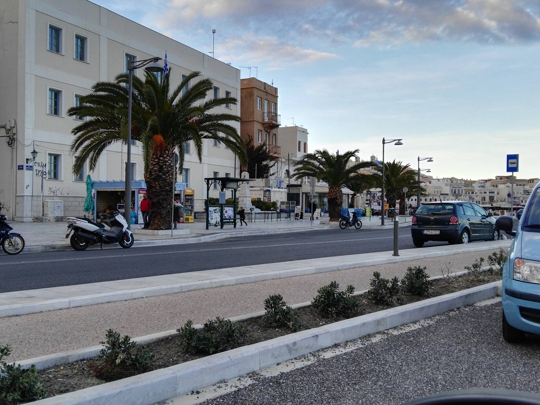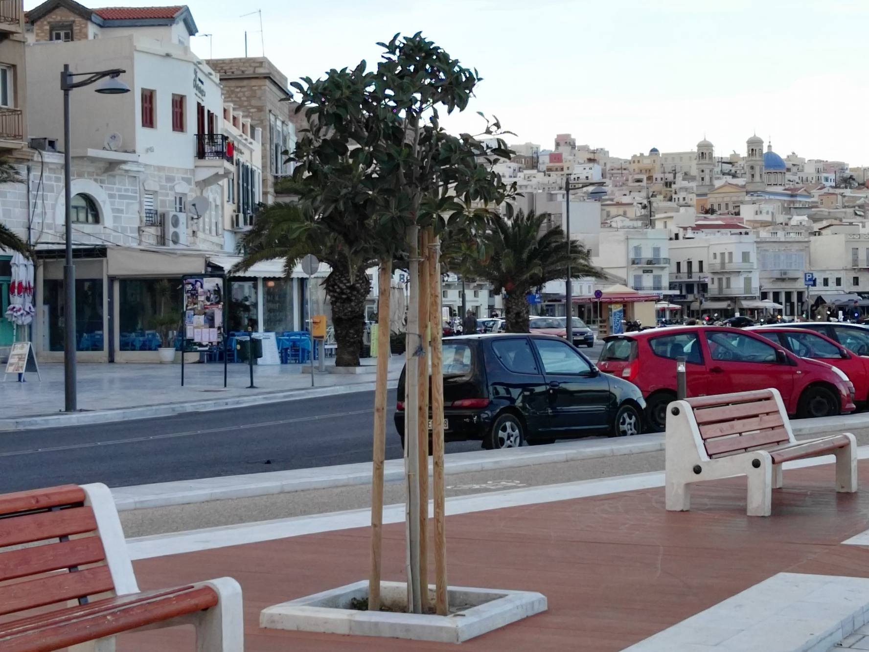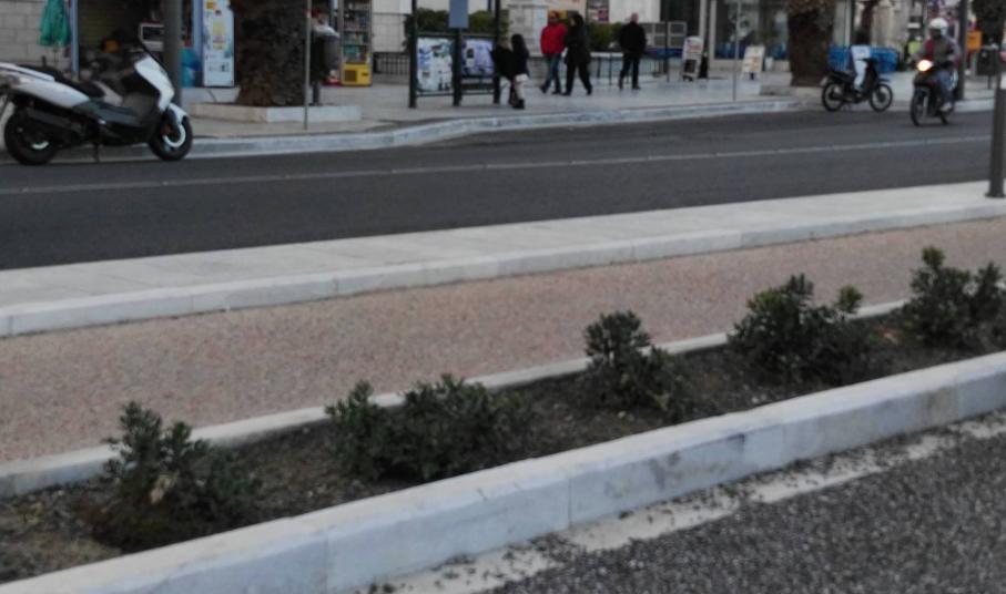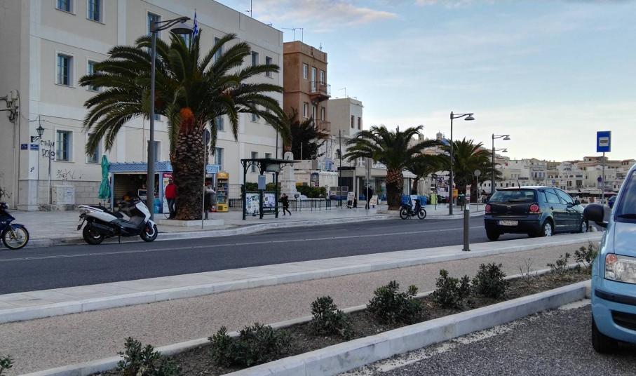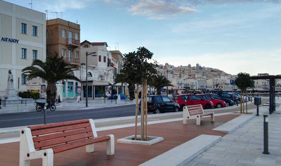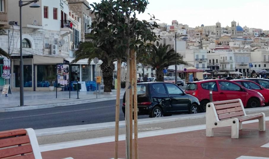 Μικρή “όαση” πρασίνου αποτελούν τα δενδρύλλια και τα μικρά παρτέρια με τα φυτά εξωτερικού χώρου κατά μήκος του παραλιακού μετώπου της Ερμούπολης, τα οποία προσελκύουν το βλέμμα των περιπατητών, αφού συνδράμουν στη διαμόρφωση ενός φιλικού περιβάλλοντος για τους δημότες.
