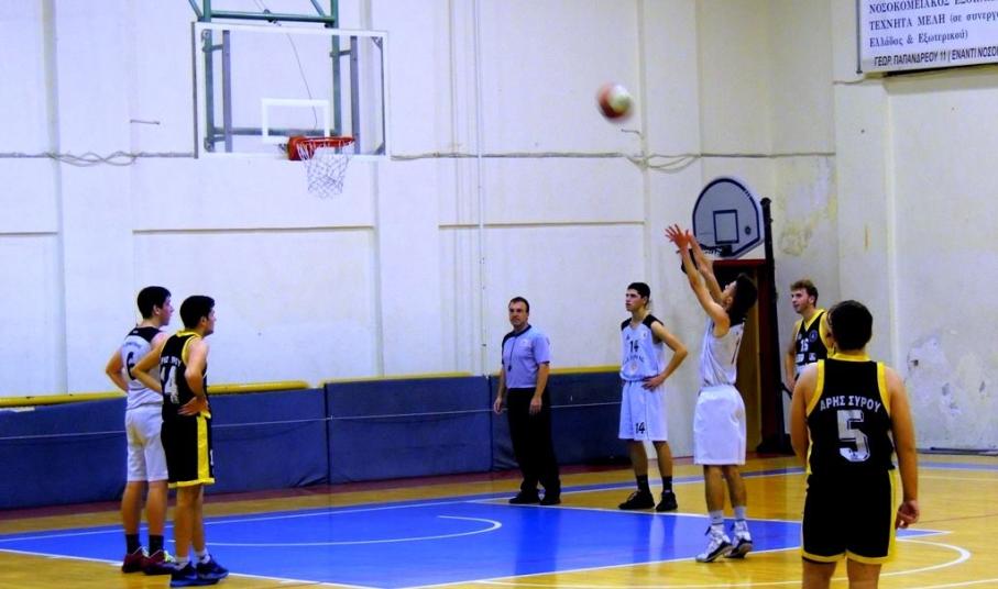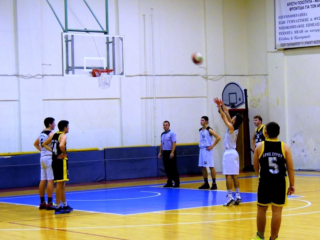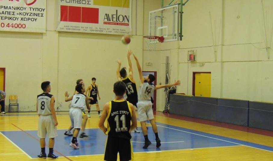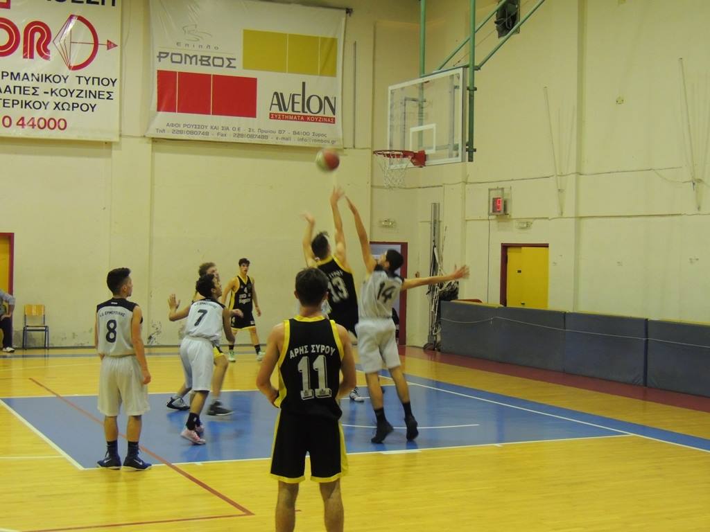 Στο επόμενο ματς, οι περσινοί πρωταθλητές, οι έφηβοι του Α.Ο. Ερμούπολης κέρδισαν σε ένα ενδιαφέρον ματς τον Άρη Σύρου με διαφορά 13 πόντων (66-79). Ο Α.Ο. Ερμούπολης μπήκε δυνατά στο ματς, αλλά δεν μπορούσε να πάρει διαφορά ασφαλείας καθώς οι γηπεδούχοι έβρισκαν τις απαντήσεις συνήθως έξω από την γραμμή των 6.75.