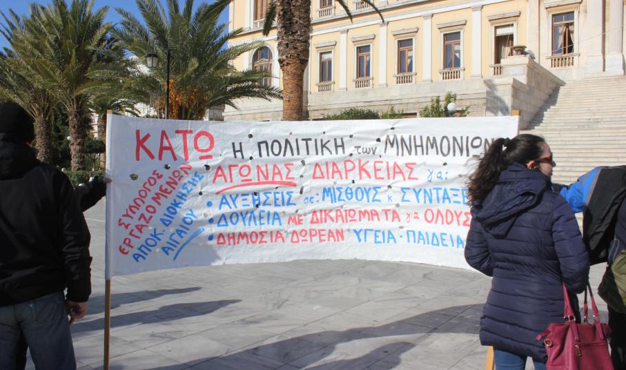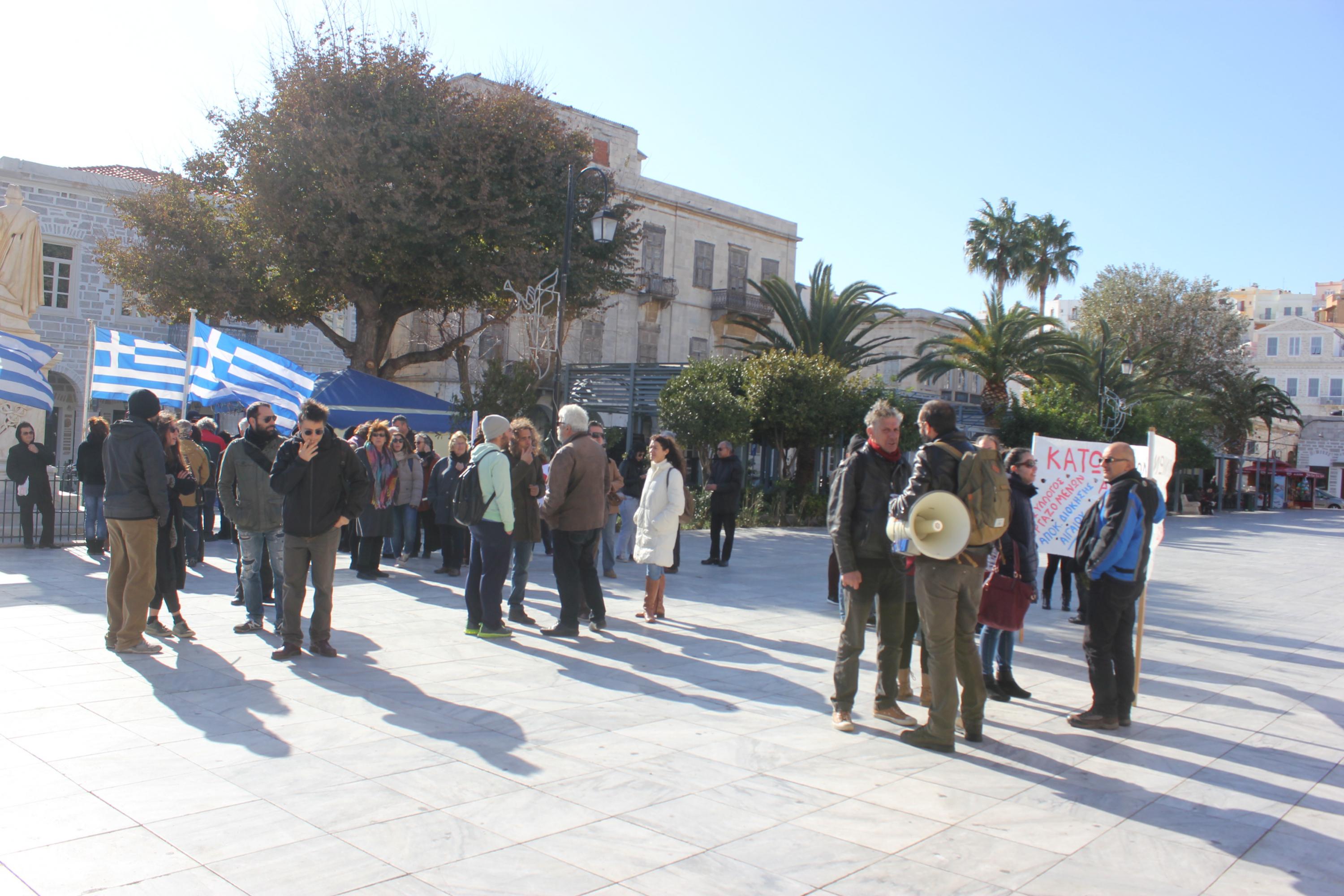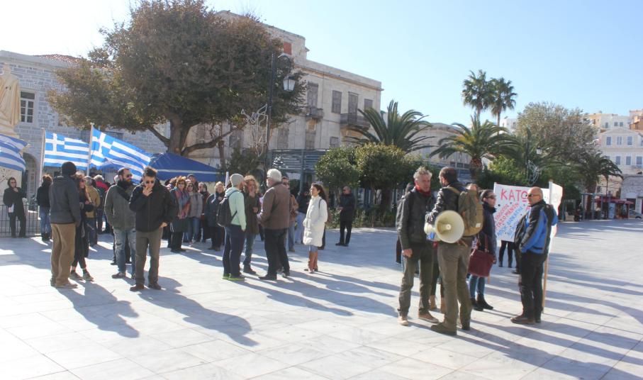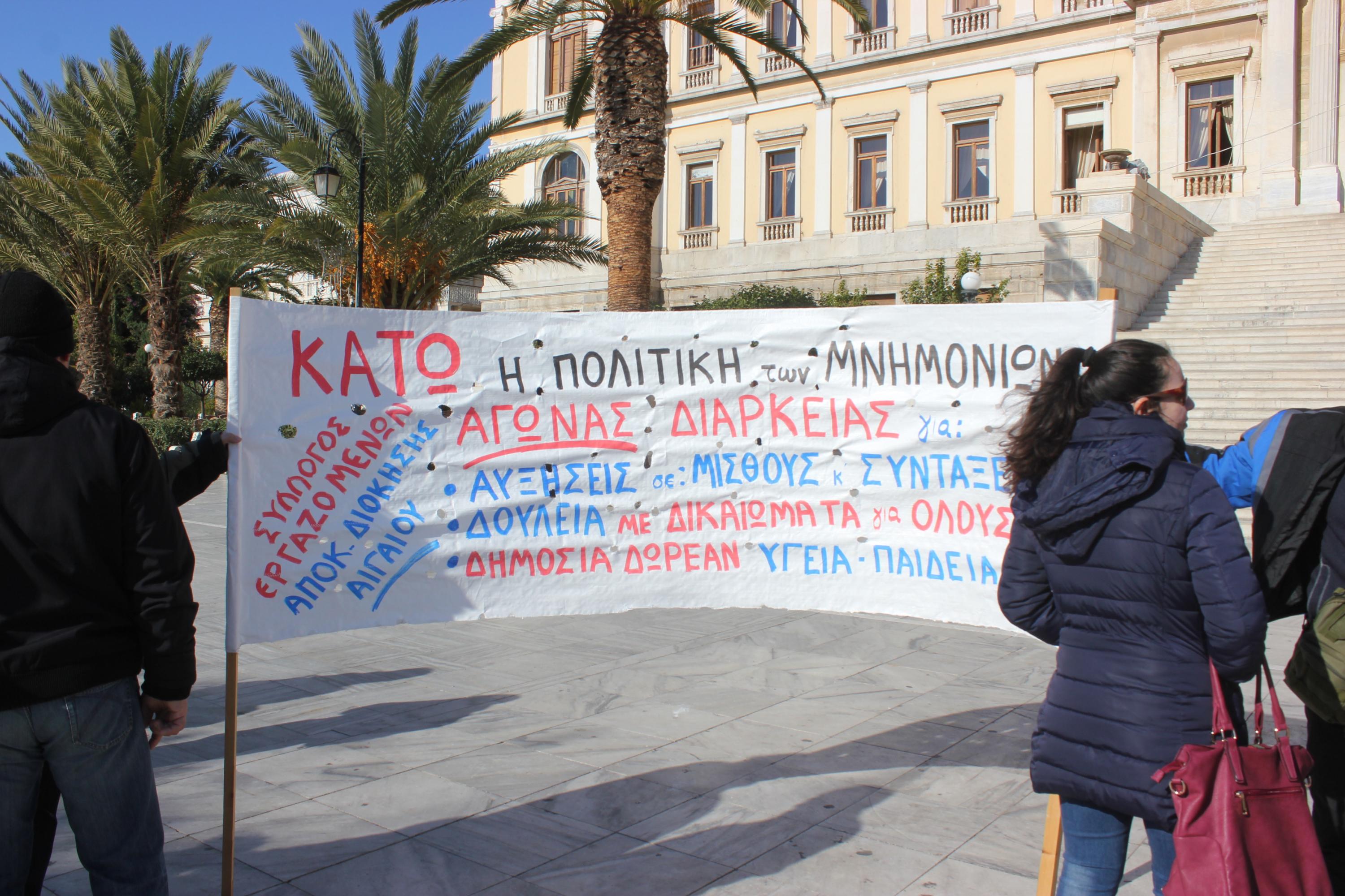Στον αντίποδα με την συγκεκριμένη συνάντηση, οι συμμετέχοντες στο κάλεσμα του ΠΑΜΕ, των εργαζομένων της Αποκεντρωμένης Διοίκησης Αιγαίου και του Συλλόγου Δασκάλων και Νηπιαγωγών Σύρου, Τήνου και Μυκόνου πραγματοποίησαν πορεία προς το κέντρο της Ερμούπολης, σε μία προσπάθεια πιο ουσιαστικής συμμετοχής στην πανελλαδική απεργία.