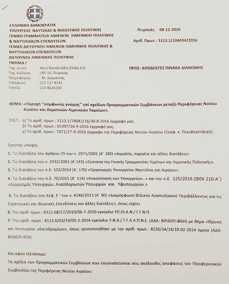 Η σύμφωνη γνώμη του Υπουργού κ. Παναγιώτη Κουρουμπλή (Αριθ.Πρωτ.: 3113.1/104434/2016), ανοίγει πλέον τον δρόμο για την υλοποίηση του μεγάλου, φιλόδοξου και ζωτικής σημασίας για τα νησιά, σχεδίου της Περιφέρειας Νοτίου Αιγαίου, για την δημιουργία δικτύου υδατοδρομίων. Έρχεται δε μόνο τρεις μέρες μετά την συνάντηση που είχε μαζί του, στο Υπουργείο, ο Περιφερειάρχης Νοτίου Αιγαίου κ. Γιώργος Χατζημάρκος, παρόντος και του Υφυπουργού κ. Νεκτάριου Σαντορινιού, όπου ετέθη το ζήτημα και τονίστηκε η ανάγκη επίσπευσης της διαδικασίας έγκρισης των Προγραμματικών Συμβάσεων, η οποία έχει καθυστερήσει σημαντικά, λόγω των αγκυλώσεων σε αντιλήψεις και νοοτροπίες υπηρεσιακών και πολιτικών παραγόντων. Στη συνάντηση της περασμένης Δευτέρας, ο Υπουργός Ναυτιλίας και Νησιωτικής Πολιτικής είχε δεσμευτεί ότι θα προχωρήσει άμεσα στην έγκριση των Προγραμματικών Συμβάσεων, προκειμένου το δίκτυο των υδατοδρομίων να εισέλθει στο στάδιο της υλοποίησης.