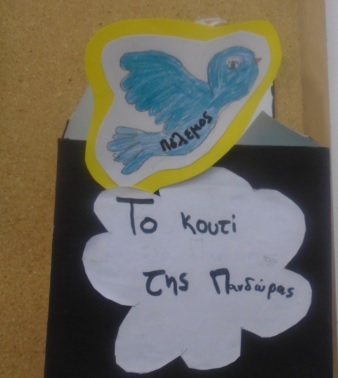 Έπειτα, μέσω παιχνιδιού η τάξη δημιούργησε τα δικά της σύμβολα θεών, σύμφωνα με όσα μελετήσει γι’ αυτούς και στο βιβλίο της Ιστορίας και στο υλικό της Μουσειοσκευής και από οπτικοακουστικό υλικό του διαδικτύου. Στη συνέχεια, οι μαθητές εικονογράφησαν γραμματόσημα με τους δώδεκα θεούς του Ολύμπου και επηρεασμένοι από το γνωστό μύθο της Πανδώρας, κατασκεύασαν το δικό τους κουτί, τοποθετώντας στο βάθος του την Ελπίδα και όλες όσες συμφορές σκέφτηκαν.