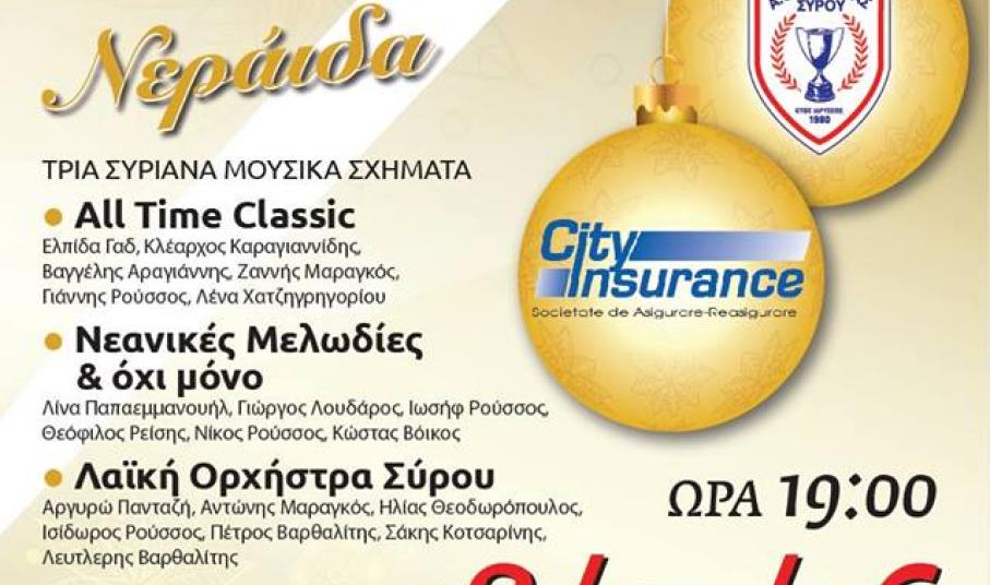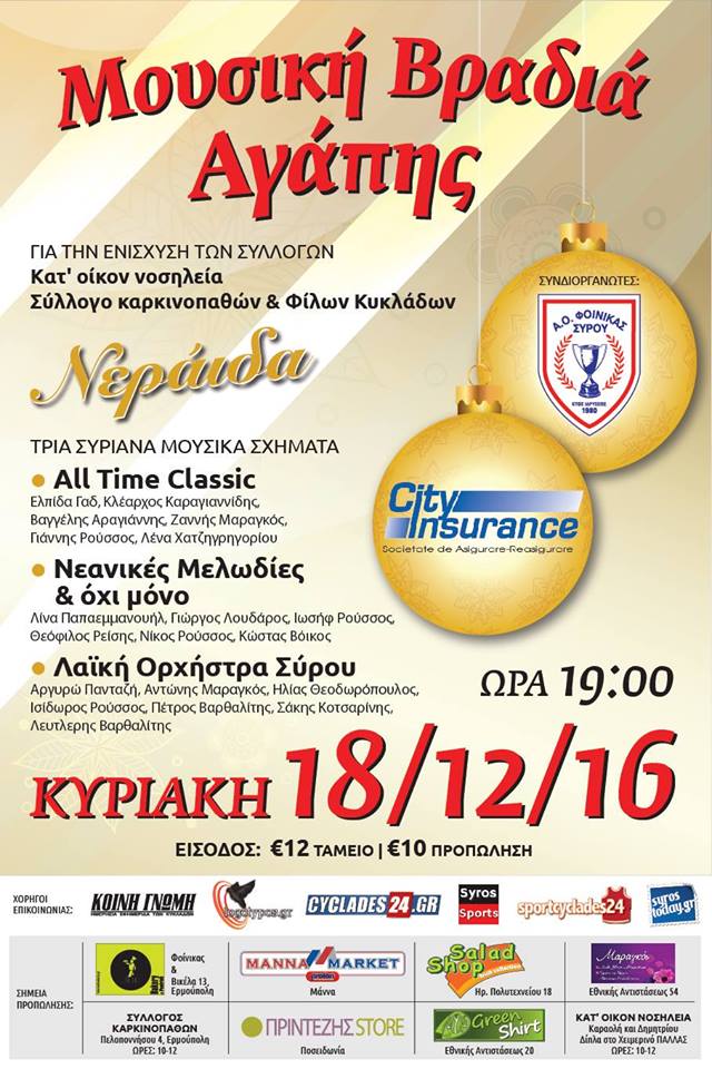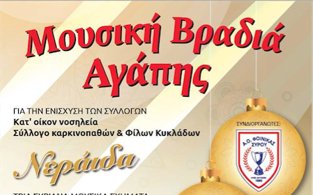 Μουσική εκδήλωση προς ενίσχυση των Συλλόγων Καρκινοπαθών και Φϊλων Κυκλάδων και Κατ΄Οίκον Νοσηλείας διοργανώνει ο ΑΟ Φοίνικας Σύρου το βράδυ της Κυριακής 18 Δεκεμβρίου, στις 7 το απόγευμα στον χώρο διασκέδασης "Νεράιδα".