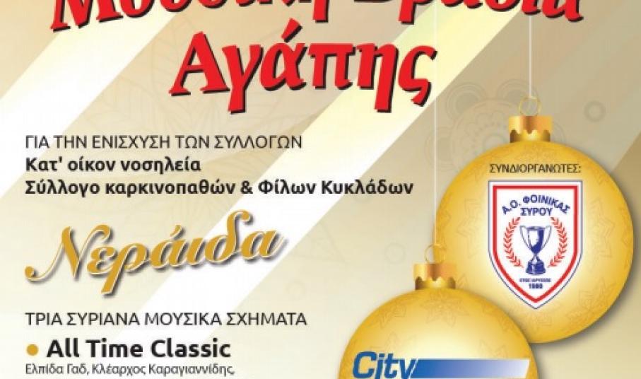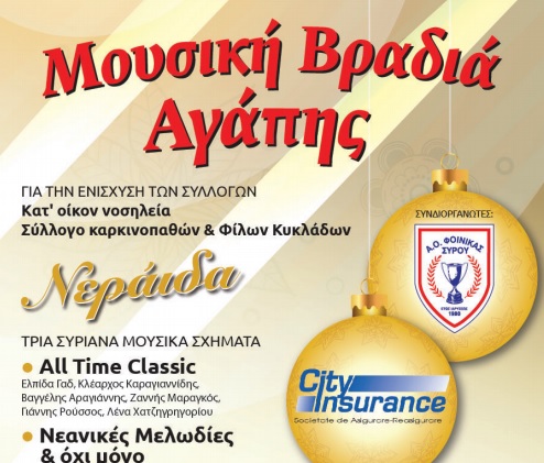 Ο Α.Ο Φοίνικα με μεγάλη χαρά σας προσκαλεί στη Μουσική Βραδιά Αγάπης που διοργανώνει σε συνεργασία με το μεγάλο του Χορηγό, την εταιρεία CITΥ INSURANCE, για την ενίσχυση των συλλόγων Σύλλογος Παροχής Φροντίδας και Κατ’ Οίκον Νοσηλείας Σύρου και Σύλλογος Καρκινοπαθών & Φίλων Κυκλάδων.