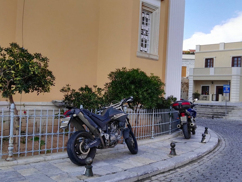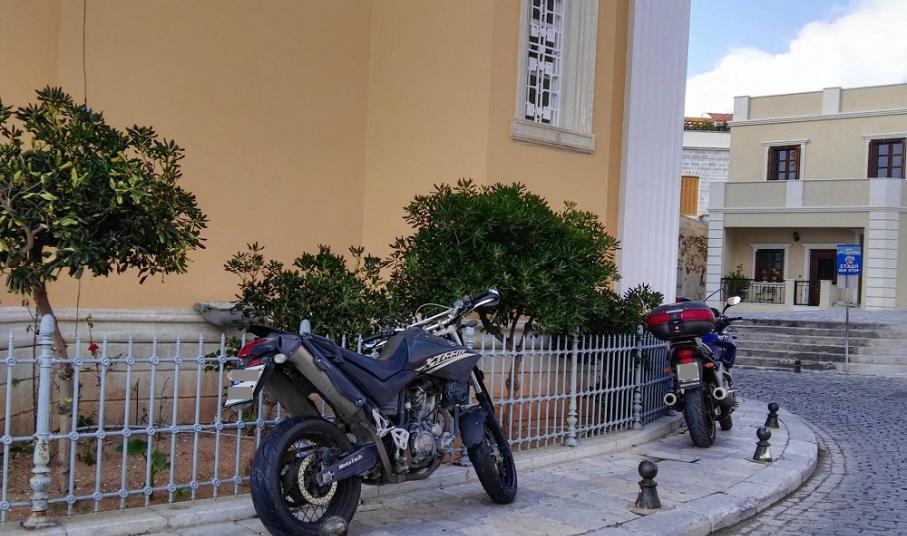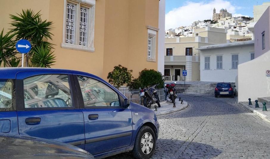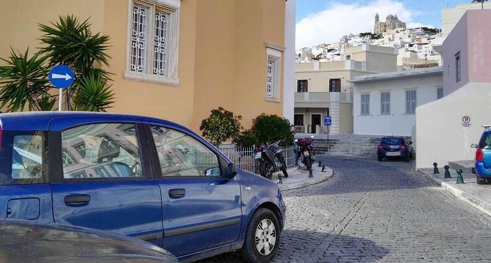Παρά το γεγονός πως τα χτιστά κολονάκια στην κεντρική είσοδο του Ι.Ν. του Αγίου Νικολάου στην Ερμούπολη περιόρισαν σημαντικά την παράνομη στάθμευση των δικύκλων ακριβώς μπροστά από την επιβλητική μαρμάρινη σκάλα του ναού, ωστόσο, μέρος αυτών έχει “μετακομίσει” στο πεζοδρόμιο όπισθεν του κτιρίου.