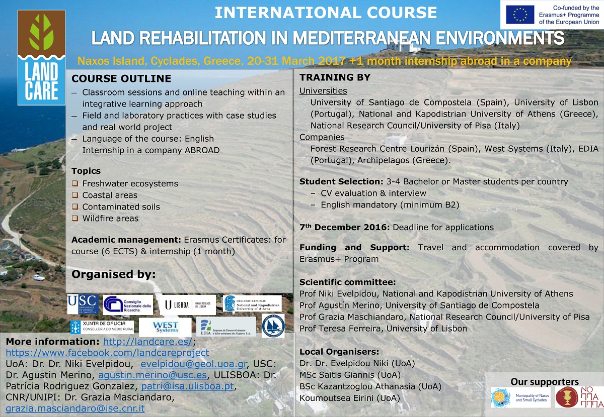Γεωπεριβάλλοντος, της Σχολής Θετικών Επιστημών του Εθνικού και Καποδιστριακού Πανεπιστημίου Αθηνών, διοργανώνει εντατικό εκπαιδευτικό σχολείο (intensive training school) στην Νάξο 20-31