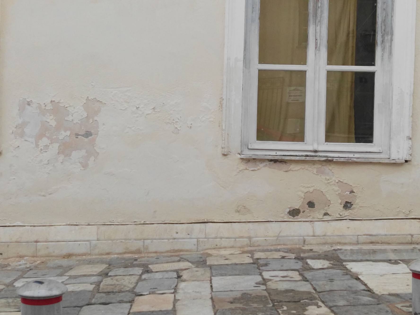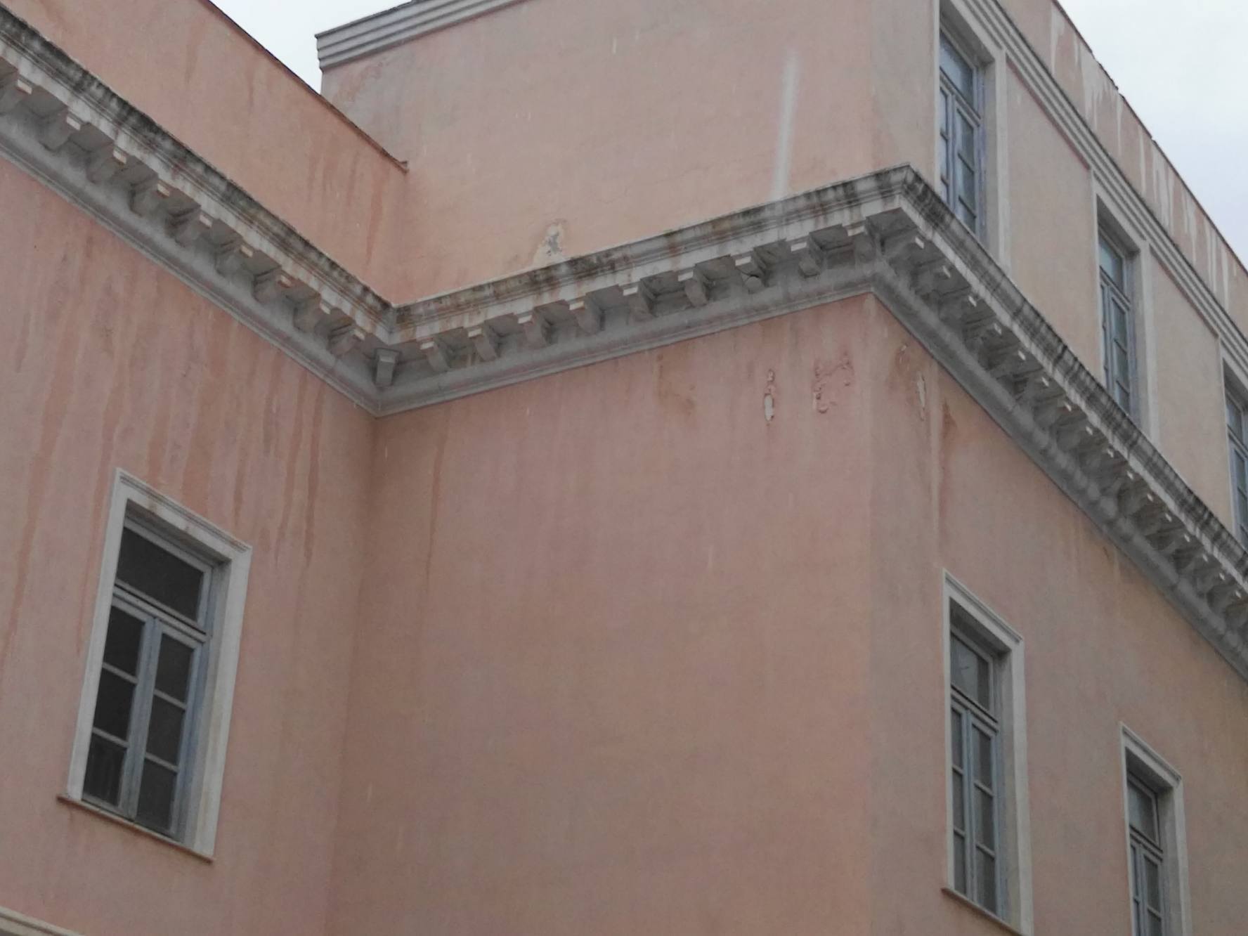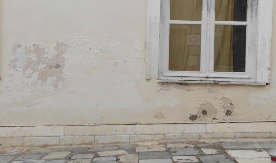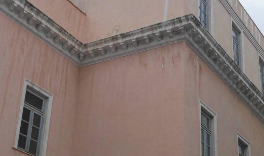 Όπως αποτυπώνεται στο σχετικό φωτογραφικό υλικό η υγρασία σε αρκετά σημεία των επιφανειών των τοίχων έχει προκαλέσει διχρωμίες ή και αλλοίωση των χρωμάτων, ενώ σε κάποια τμήματα παρατηρείται και η αποκόλληση σοβάδων. Αν και η πρώτη εικόνα της εισόδου του κτιρίου διατηρείται σε ανεκτή κατάσταση, ωστόσο τα μεγαλύτερα προβλήματα διαπιστώνονται και παρατηρούνται τόσο στην πίσω πλευρά του κτιρίου, όσο όμως και στον αύλειο χώρο του. Εκτός από την ατονία των χρωμάτων, η κάλυψη συνθημάτων και γκράφιτι με χρώμα διαφορετικής απόχρωσης από εκείνο των υπόλοιπων επιφανειών, διαμορφώνει “μπαλώματα”, που σε συνδυασμό με τα προβλήματα και στα ξύλινα κουφώματα, συνθέτουν σταδιακά μία αντιαισθητική εικόνα.