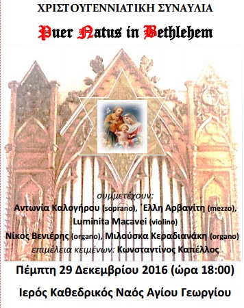 Ο Σύλλογος Φίλων Εκκλησιαστικού Οργάνου διοργανώνει την Πέμπτη 29 Σεπτεμβρίου και ώρα 18:00 στον Ιερό Καθεδρικό Ναό Αγίου Γεωργίου στην Άνω Σύρο χριστουγεννιάτικη συναυλία με τον τίτλο "Puer Natus in Bethlehem".