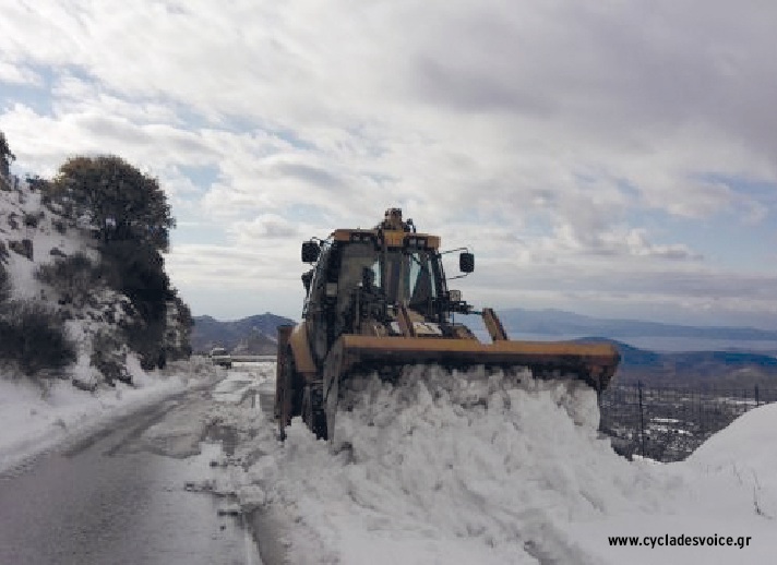 Οι αρμόδιες υπηρεσίες των Δήμων των νησιών δηλώνουν ότι βρίσκονται σε πλήρη ετοιμότητα για την αντιμετώπιση των προβλημάτων που προκύπτουν, με χαρακτηριστική την άμεση ενεργοποίηση που καταγράφηκε στη Νάξο για τον καθαρισμό από το χιόνι των ορεινών οδών.