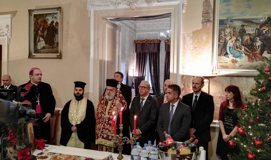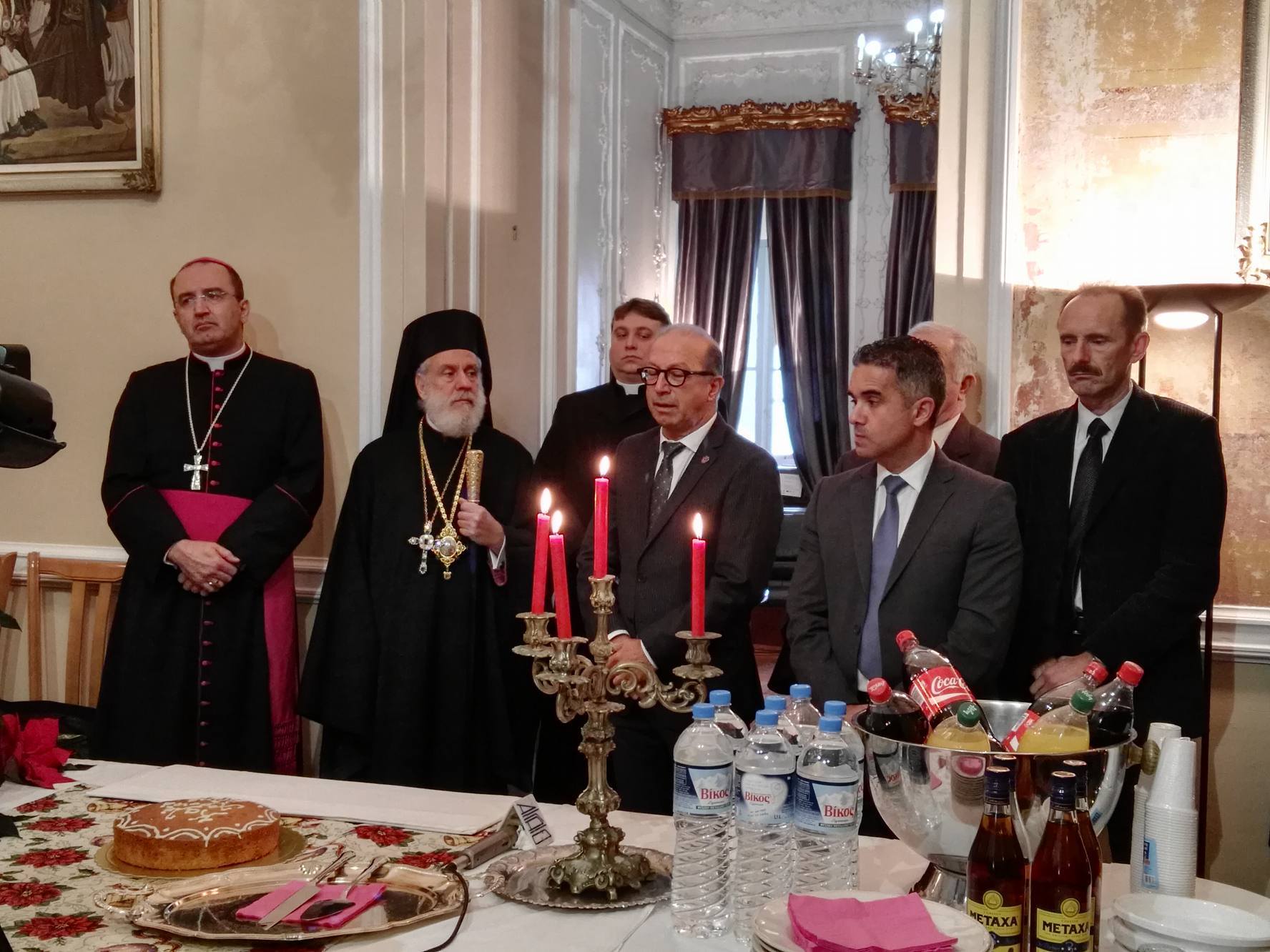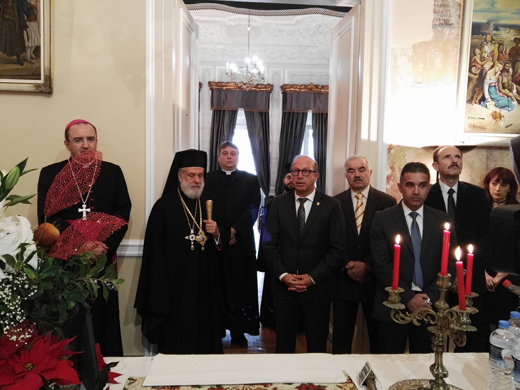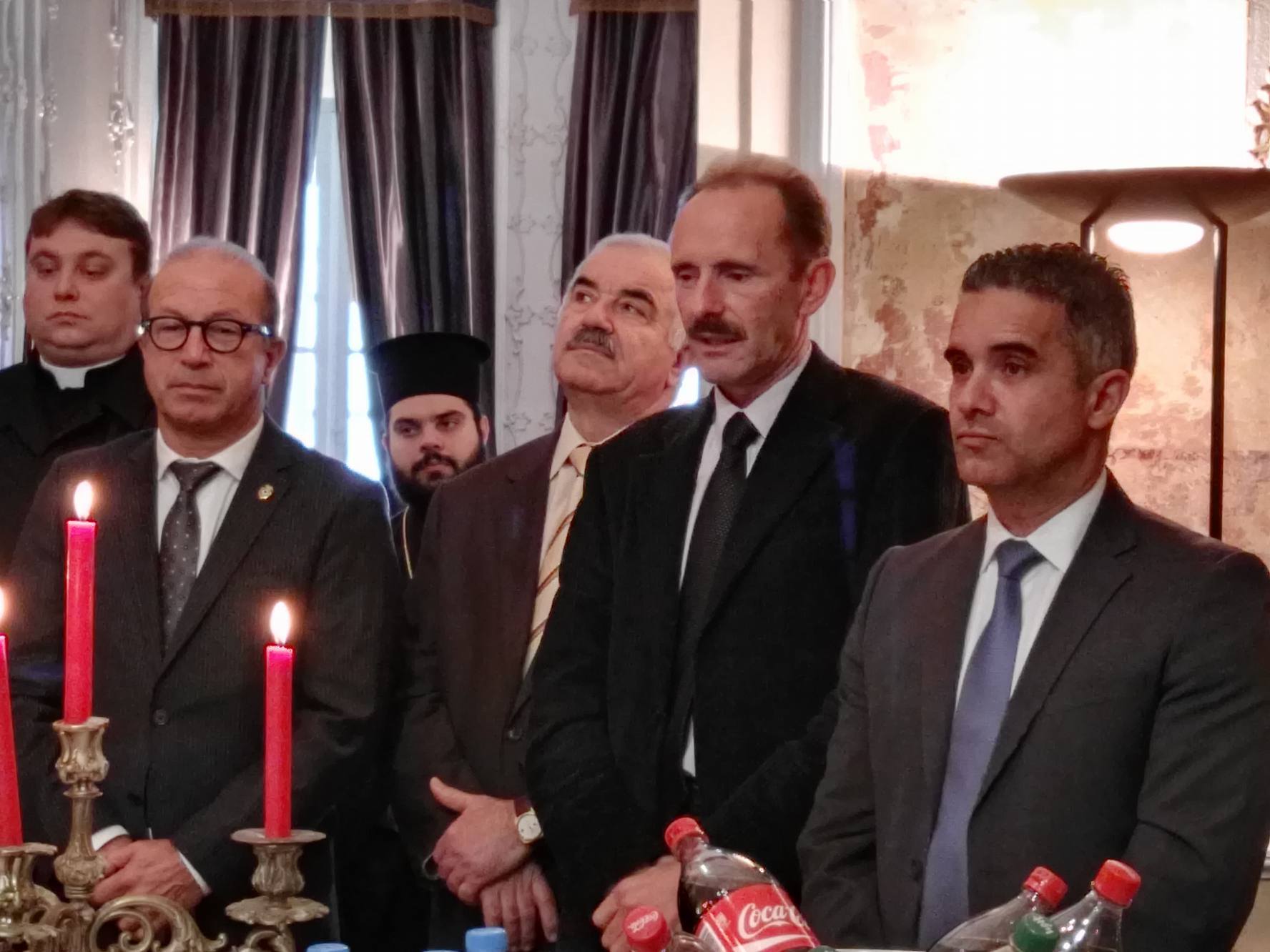 Παρουσία των Επισκόπων της Ορθόδοξης και της Καθολικής Εκκλησίας, του Σεβασμιωτάτου Μητροπολίτη Σύρου, κ. Δωροθέου Β΄ και του Σεβ. π. Πέτρου Στεφάνου αντίστοιχα, καθώς επίσης του Δημάρχου Σύρου – Ερμούπολης, Γιώργου Μαραγκού, του προέδρου του Επιμελητηρίου Κυκλάδων, Γιάννη Ρούσσου, αντιδημάρχων, περιφερειακών και δημοτικών συμβούλων και υπαλλήλων της Περιφέρειας, ο Αντιπεριφερειάρχης Κυκλάδων απηύθυνε ευχές προς όλους, δίνοντας έμφαση στο θέμα της νησιωτικότητας.