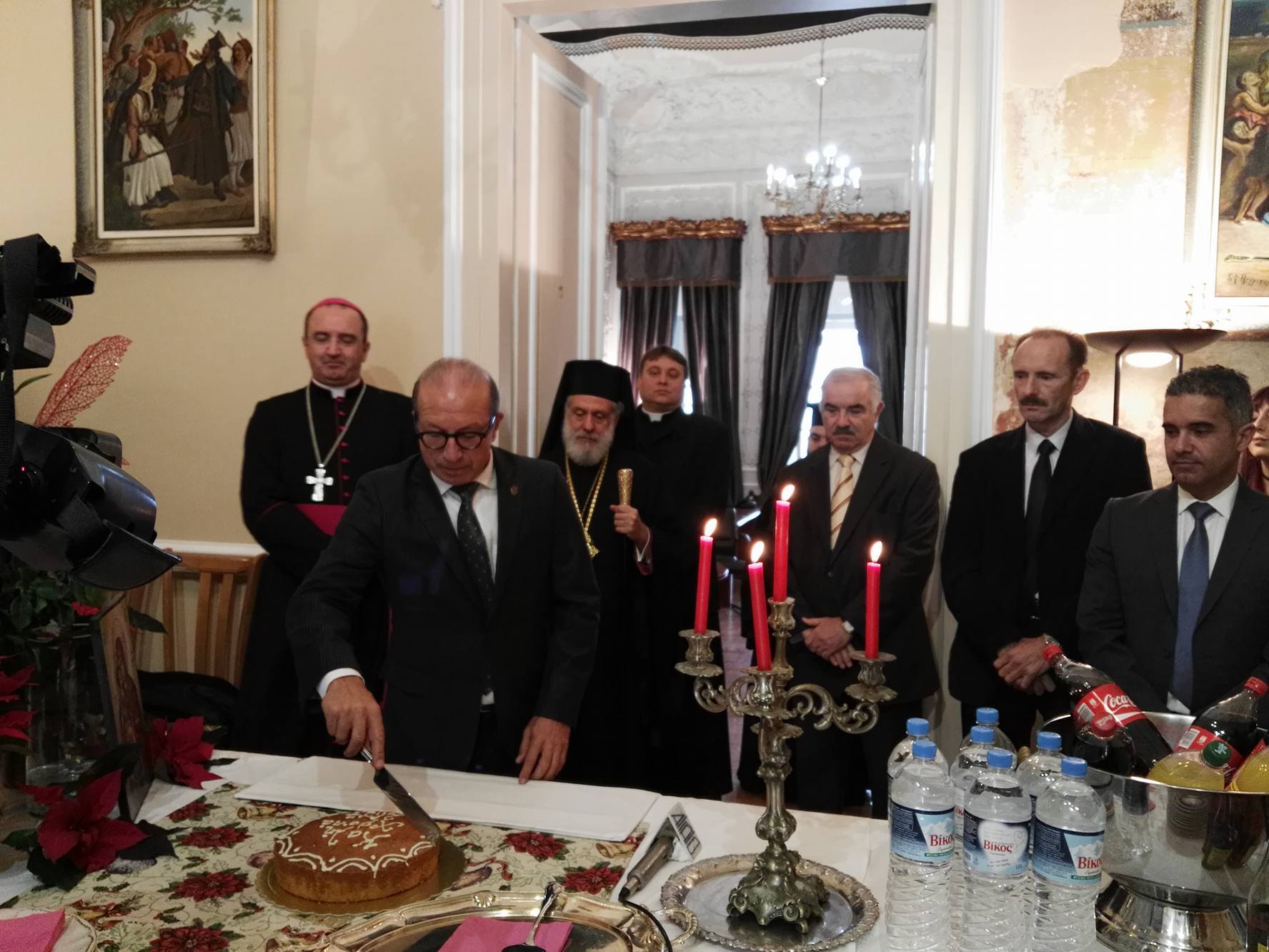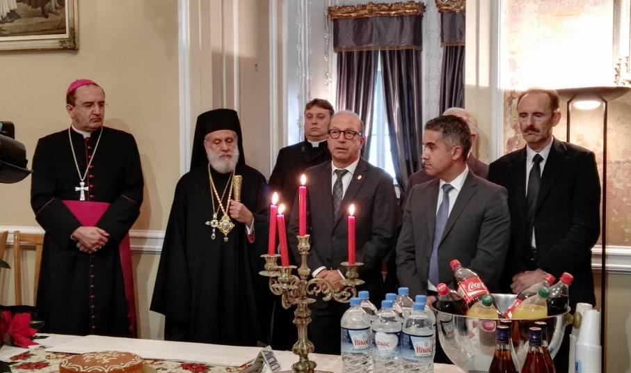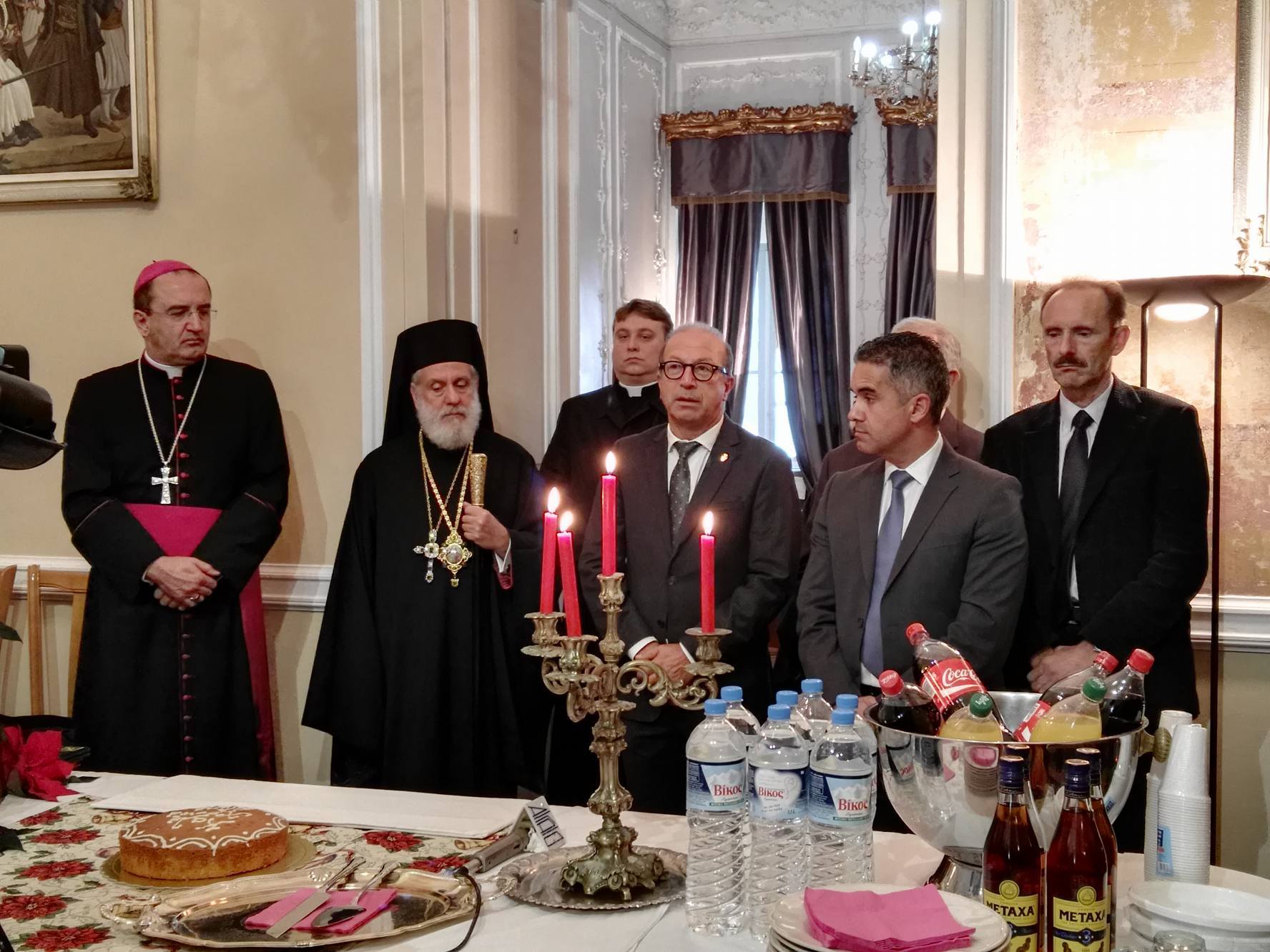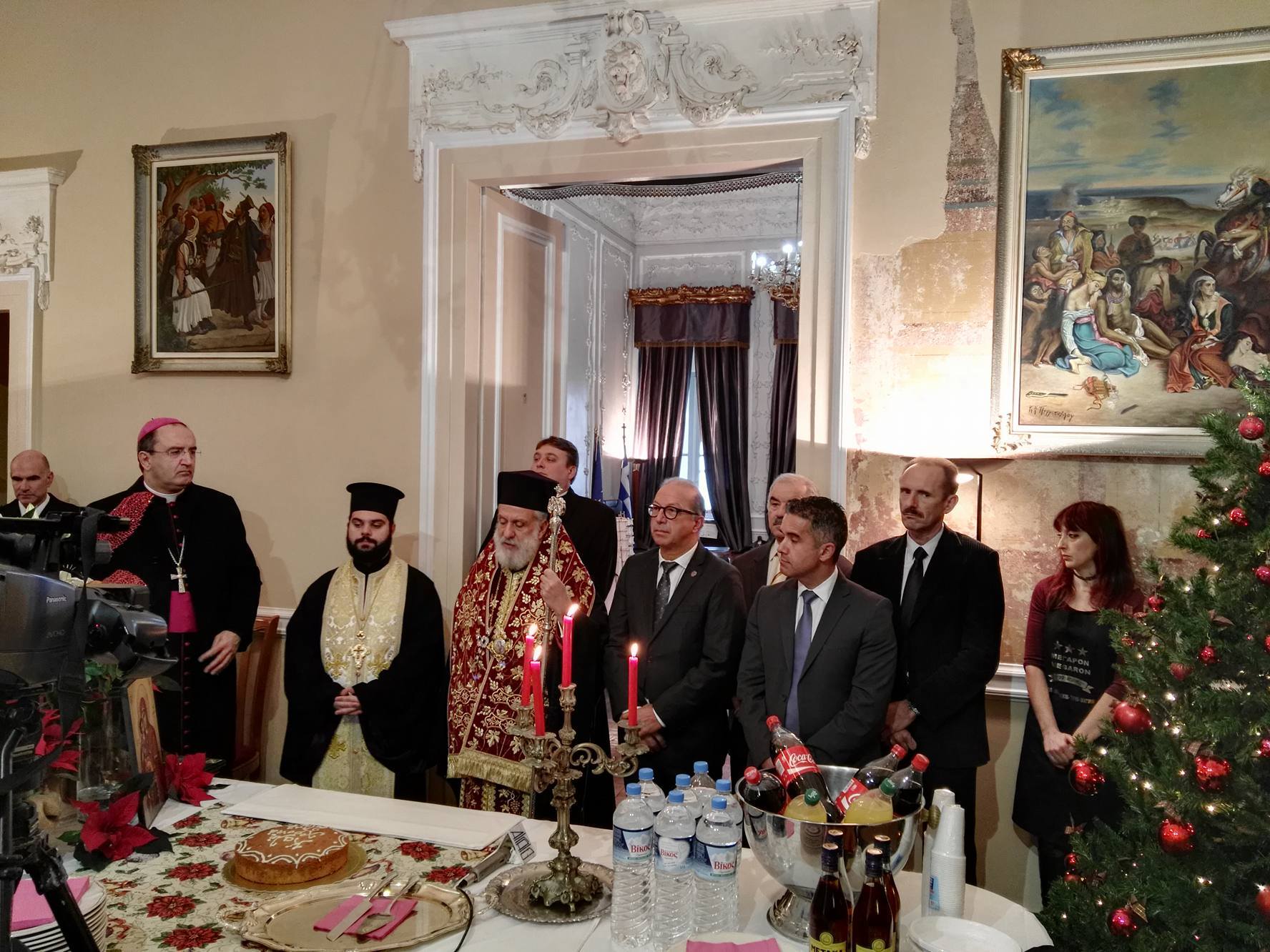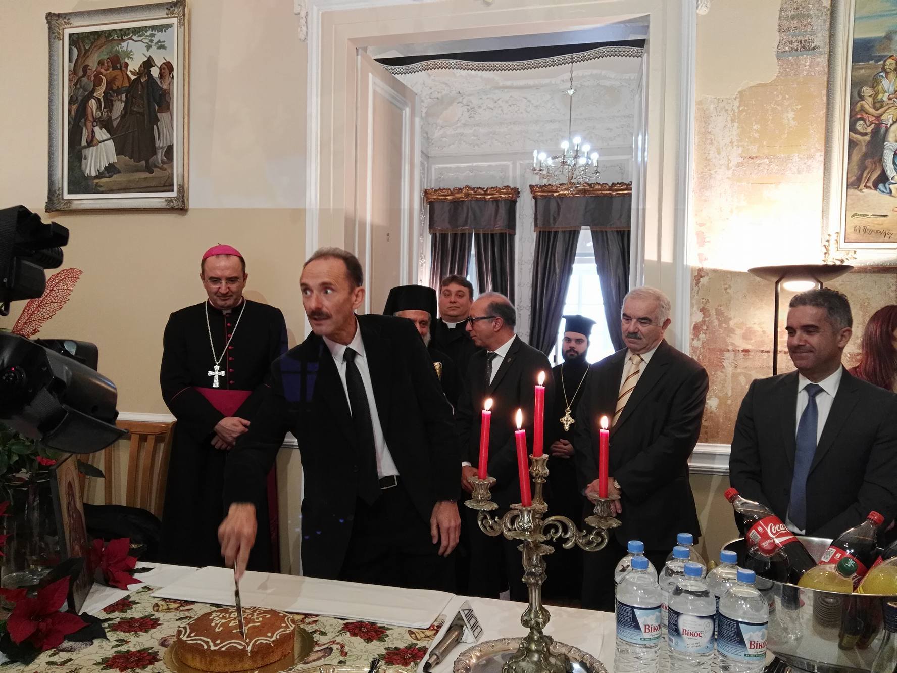 Παρουσία των Επισκόπων της Ορθόδοξης και της Καθολικής Εκκλησίας, του Σεβασμιωτάτου Μητροπολίτη Σύρου, κ. Δωροθέου Β΄ και του Σεβ. π. Πέτρου Στεφάνου αντίστοιχα, καθώς επίσης του Δημάρχου Σύρου – Ερμούπολης, Γιώργου Μαραγκού, του προέδρου του Επιμελητηρίου Κυκλάδων, Γιάννη Ρούσσου, αντιδημάρχων, περιφερειακών και δημοτικών συμβούλων και υπαλλήλων της Περιφέρειας, ο Αντιπεριφερειάρχης Κυκλάδων απηύθυνε ευχές προς όλους, δίνοντας έμφαση στο θέμα της νησιωτικότητας.