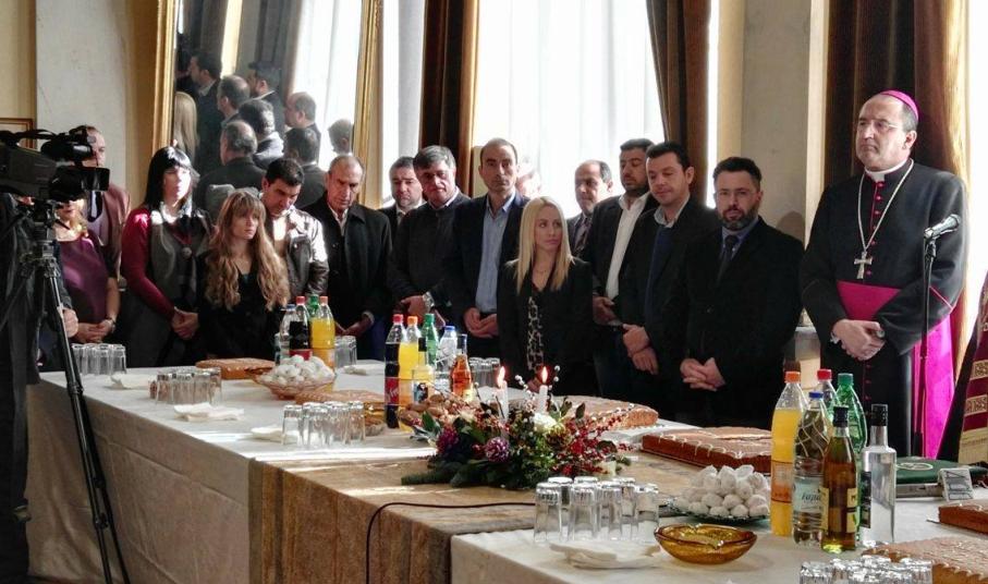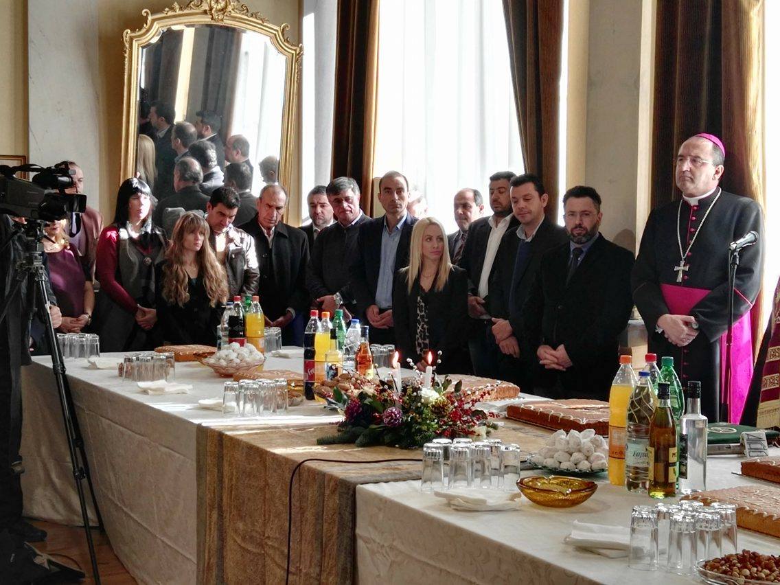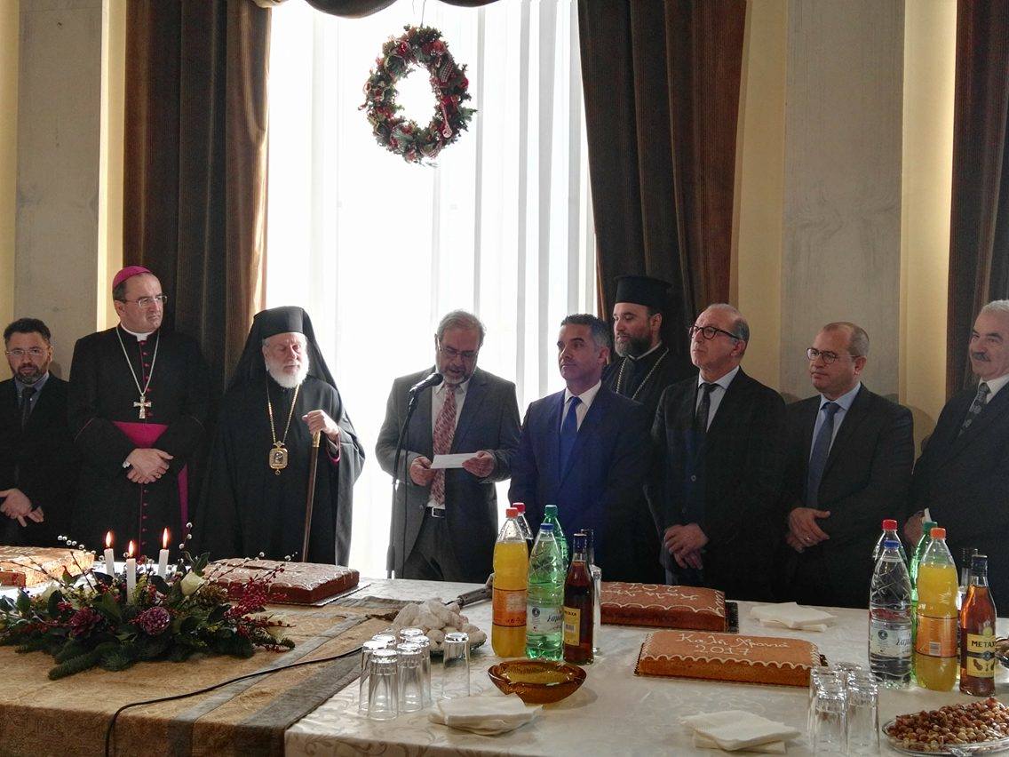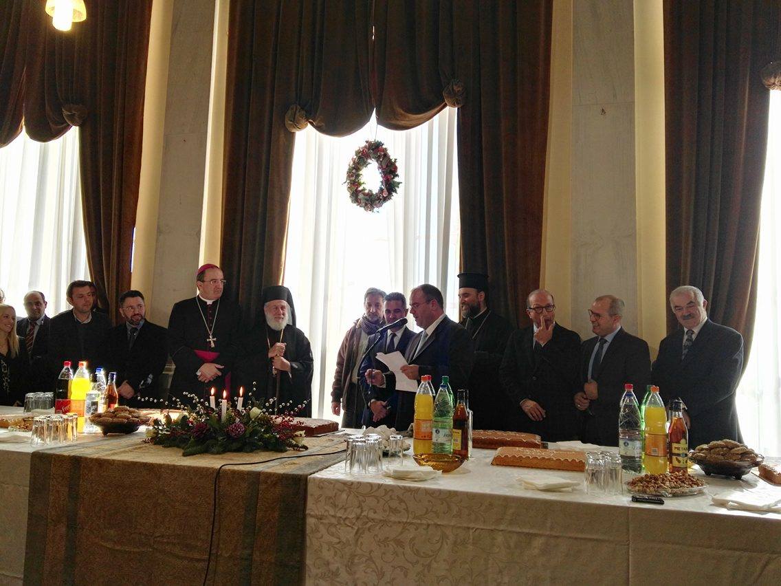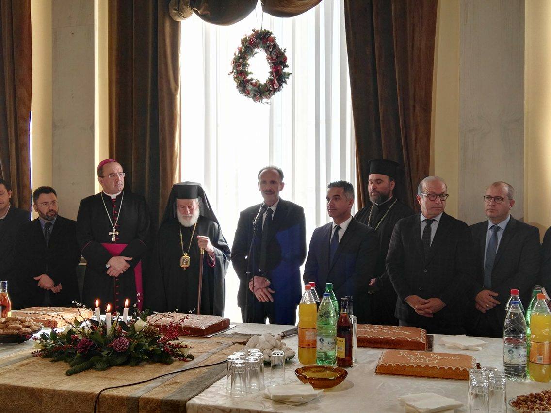 Ο κ. Μαραγκός πλαισιωμένος από τον Σεβασμιώτατο Μητροπολίτη Σύρου, κ. Δωρόθεο Β΄, τον Καθολικό Επίσκοπο Σύρου, Σεβ. π. Πέτρο Στεφάνου, τον Αντιπεριφερειάρχη Κυκλάδων, Γιώργο Λεονταρίτη, καθώς επίσης, τους αντιδημάρχους, τους εκπροσώπους των αντιπολιτευόμενων παρατάξεων, αλλά και αιρετούς του Δήμου Σύρου – Ερμούπολης, τον πρόεδρο του Επιμελητηρίου Κυκλάδων, Γιάννη Ρούσσο κι εκπροσώπων τοπικών Συλλόγων και των Σωμάτων Ασφαλείας υποδέχθηκε την άφιξη του νέου έτους στο Δημαρχιακό Μέγαρο.