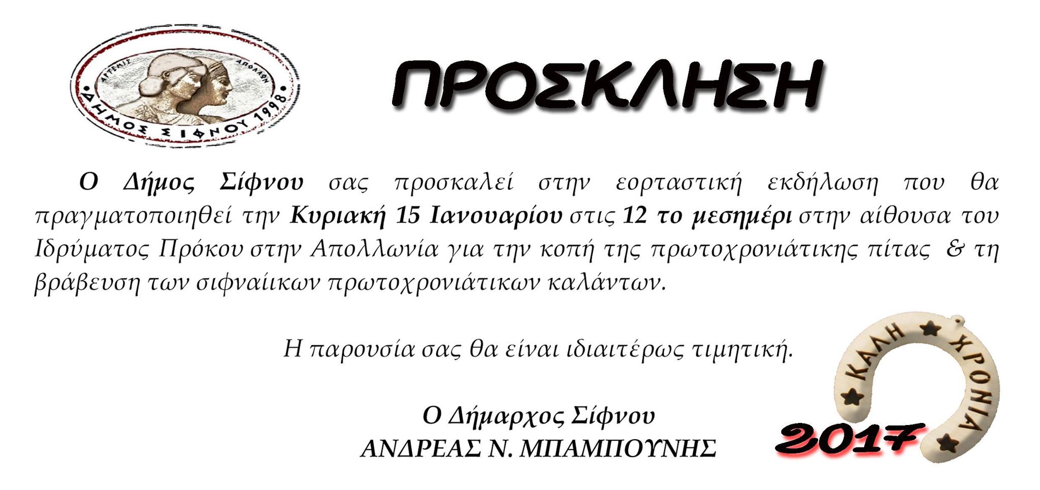 Ο Δήμος Σίφνου προσκαλεί τους φίλους του στην εορταστική εκδήλωση που θα πραγματοποιηθεί την Κυριακή 15 Ιανουαρίου στις 12 το μεσημέρι στην αίθουσα του Ιδρύματος Πρόκου στην Απολλωνία για την κοπή της πρωτοχρονιάτικης πίτας και τη βράβευση των σιφναίικων πρωτοχρονιάτικων καλάντων.