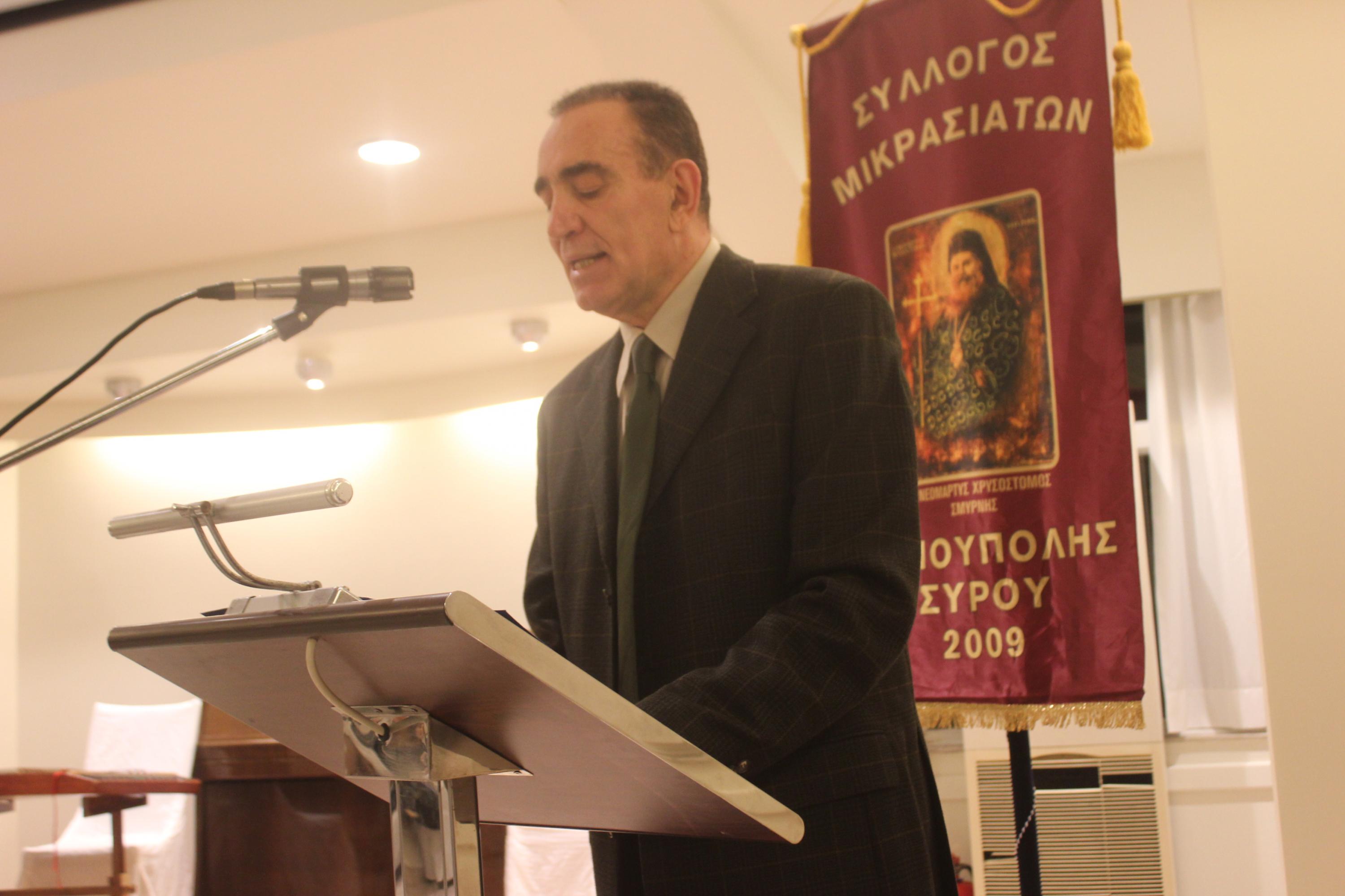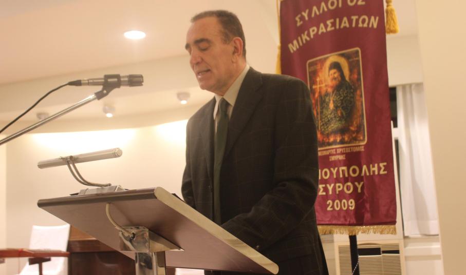 Στον χαιρετισμό του, ο κ. Δωρόθεος, αφού ανέφερε ότι σήμερα έχει πλέον πεθάνει και ο τελευταίος Μικρασιάτης, υπογράμμισε την ανάγκη διατήρησης της ιστορικής μνήμης και τη μετάδοσή της στα παιδιά μας και τόνισε την προς τούτο σημαντική συνεισφορά του Συλλόγου Μικρασιατών Ερμούπολης Σύρου.