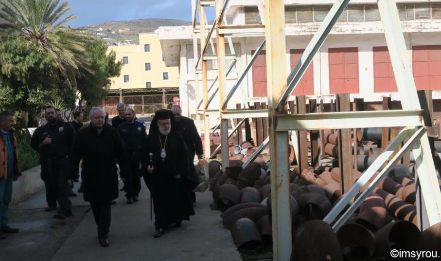 Στις εγκαταστάσεις των Ναυπηγείων του "ΝΕΩΡΙΟΥ" Σύρου μετέβη σήμερα ο Σεβασμιώτατος κ. Δωρόθεος Β' , συνοδευόμενος από τον Αρχιερατικό Επίτροπο Σύρου, Πρωτοπρ. Φαβιανό Αλμπέσκου, και τους Διακόνους του, κατόπιν προσκλήσεως των Αξιωματικών του Πολεμικού Ναυτικού, που εποπτεύουν την επισκευαζόμενη στο Ναυπηγείο Δεξαμενή του ΠΝ, γενόμενος δεκτός με εγκαρδιότητα από τον Διευθύνοντα Σύμβουλο της Επιχείρησης κ. Ιω. Στεφάνου, τον Διοικητή της Ομάδος των Αξιωματικών του ΠΝ κ. Χαντρομαντζίδη Γεώργιο, και τον Πρόεδρο των Εργαζομένων στα Ναυπηγεία κ. Μάνθο Ευάγγελο.