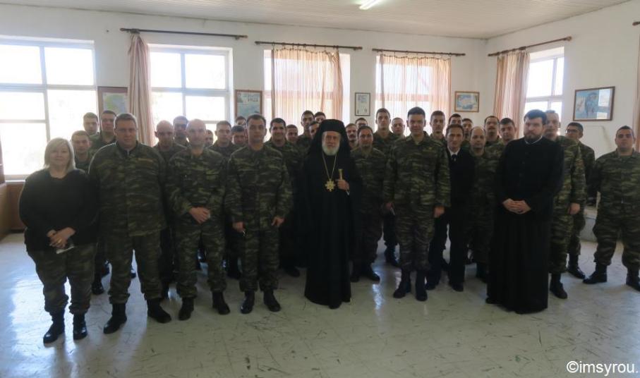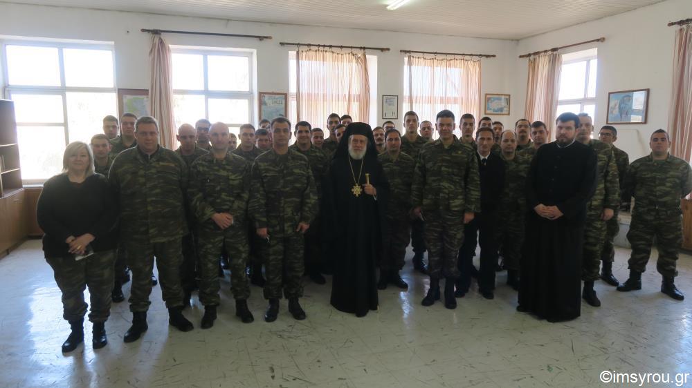 Στον Διοικητή, τον Υποδιοικητή, το Διευθυντή του Στρατολογικού Γραφείου, τους Αξιωματικούς, Υπαξιωματικούς και οπλίτες του Τάγματος Σύρου ευχήθηκε σήμερα ο Σεβασμιώτατος κ. Δωρόθεος Β΄ , ο οποίος πραγματοποίησε ποιμαντική εόρτια επίσκεψη για το νέο έτος, γενόμενος δεκτός με εκδηλώσεις αγάπης, τιμής και σεβασμού, προς τους οποίους ομίλησε τους συγκεντρωμένους στρατιώτες, τους ευχήθηκε για τη μελλοντική σταδιοδρομία τους, τους παρότρυνε να αξιοποιήσουν αυτή την ιστορική χρονική καμπή της ζωής τους, προκειμένου να αποκομίσουν εμπειρίες και να γνωρίσουν καλύτερα τον εαυτό τους.