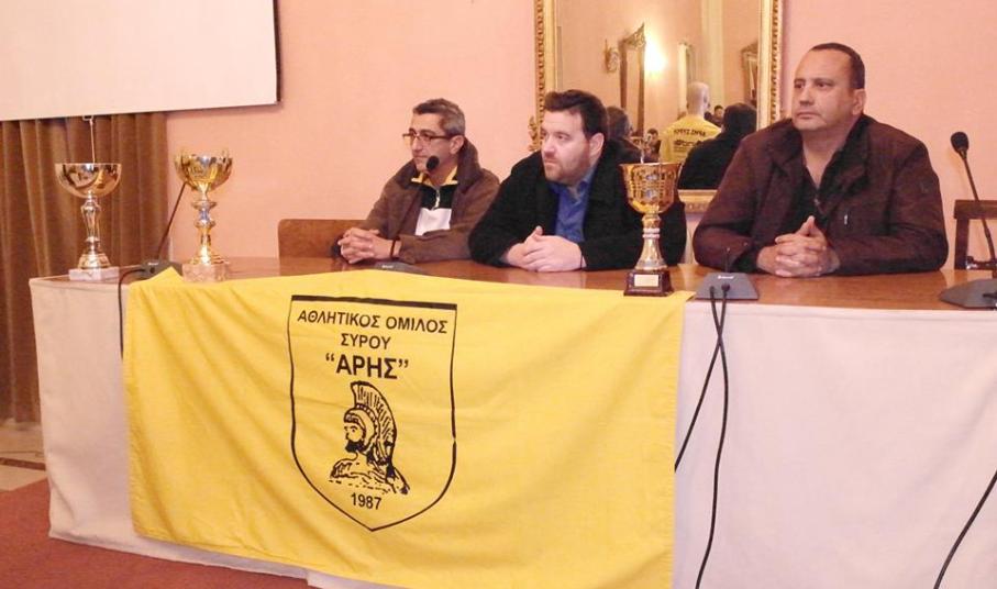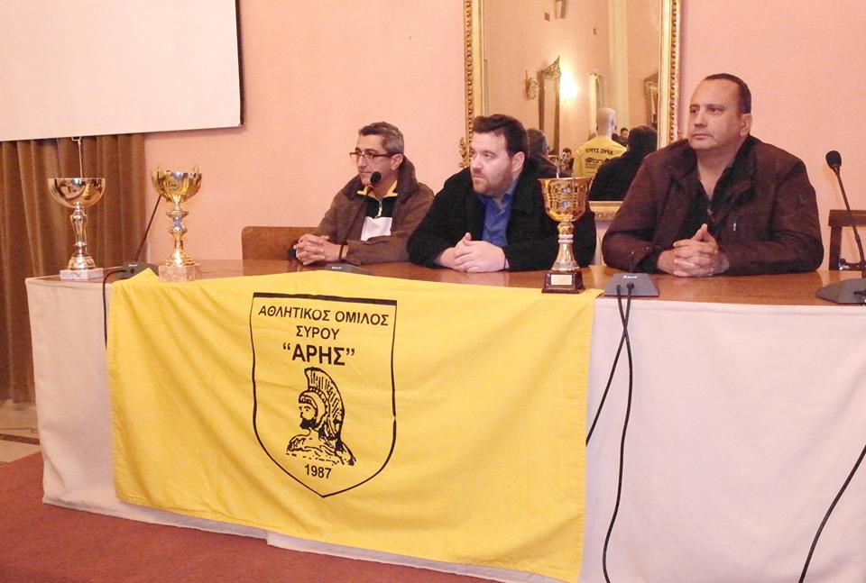 Στον χαιρετισμό του ο πρόεδρος του Άρη Σύρου κ. Αντώνης Βαρθαλίτης δεν θέλησε να σταθεί στα προβλήματα και τις δυσκολίες που αντιμετωπίζουν όλα τα ερασιτεχνικά σωματεία, αλλά επικεντρώθηκε στα θετικά της χρονιάς που πέρασε και έστειλε μήνυμα αισιοδοξίας για τη χρονιά που ξεκίνησε.
