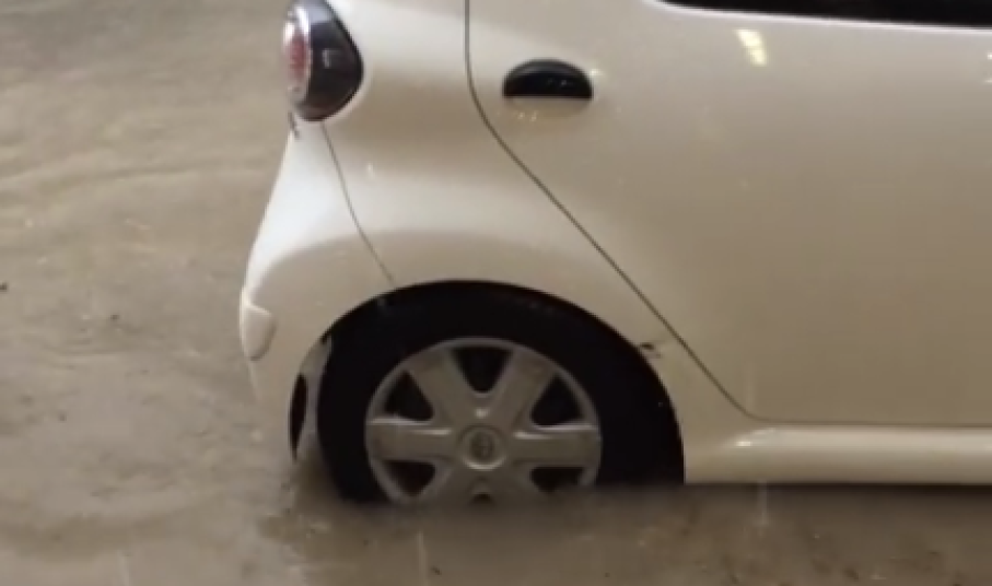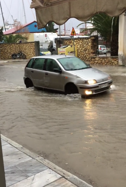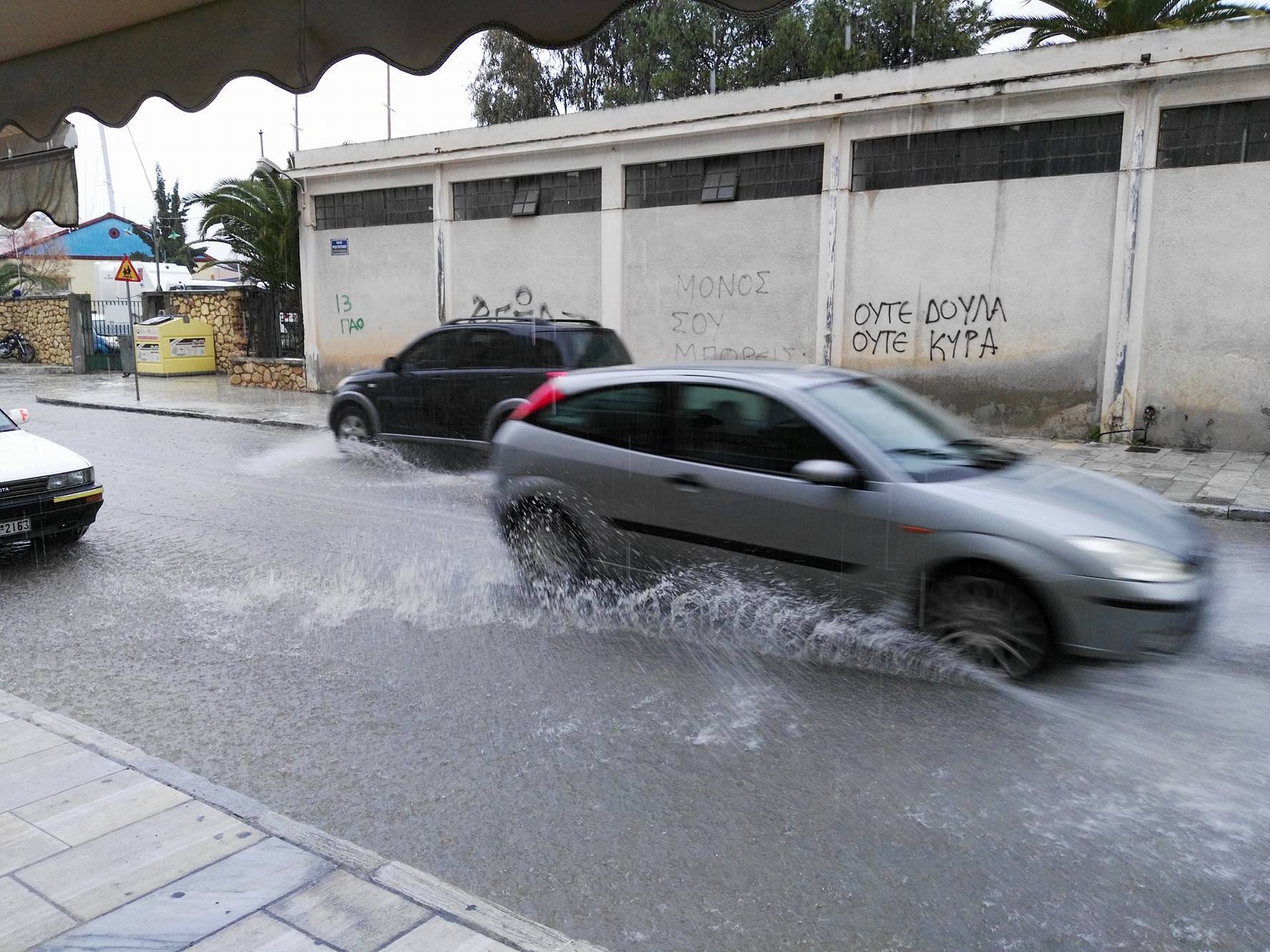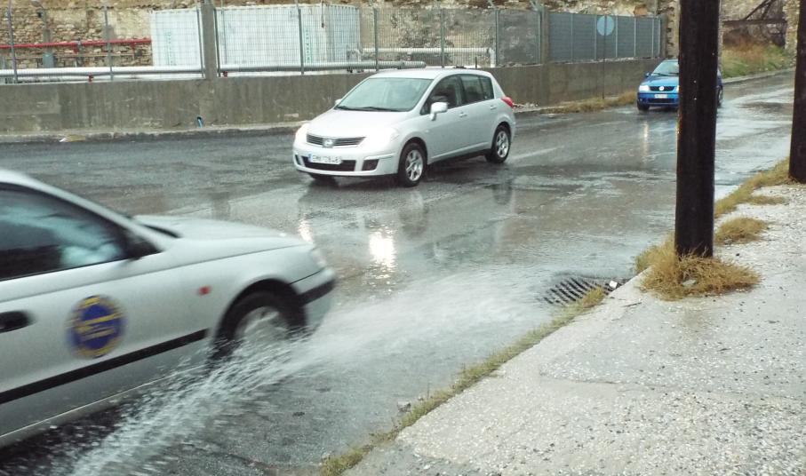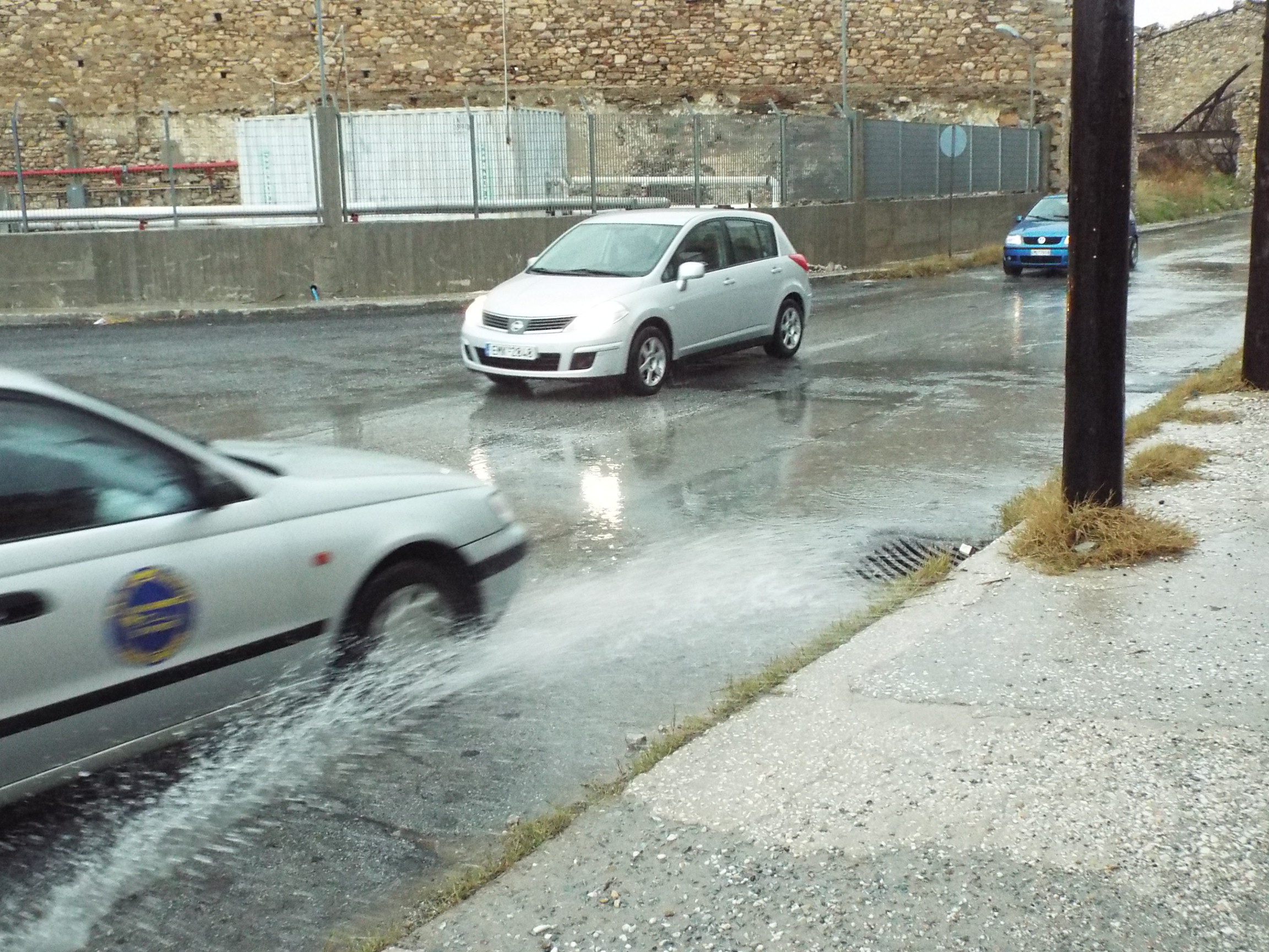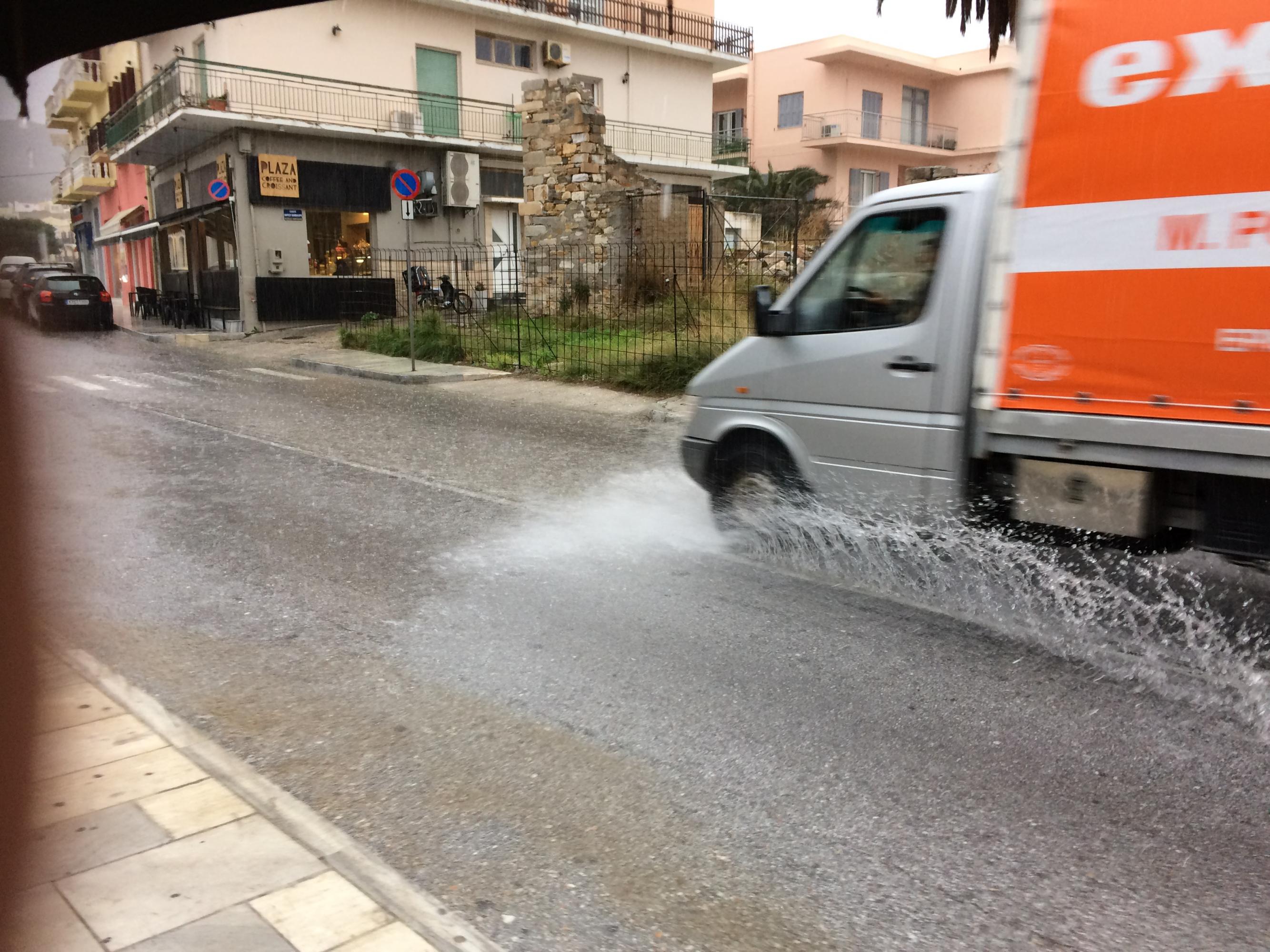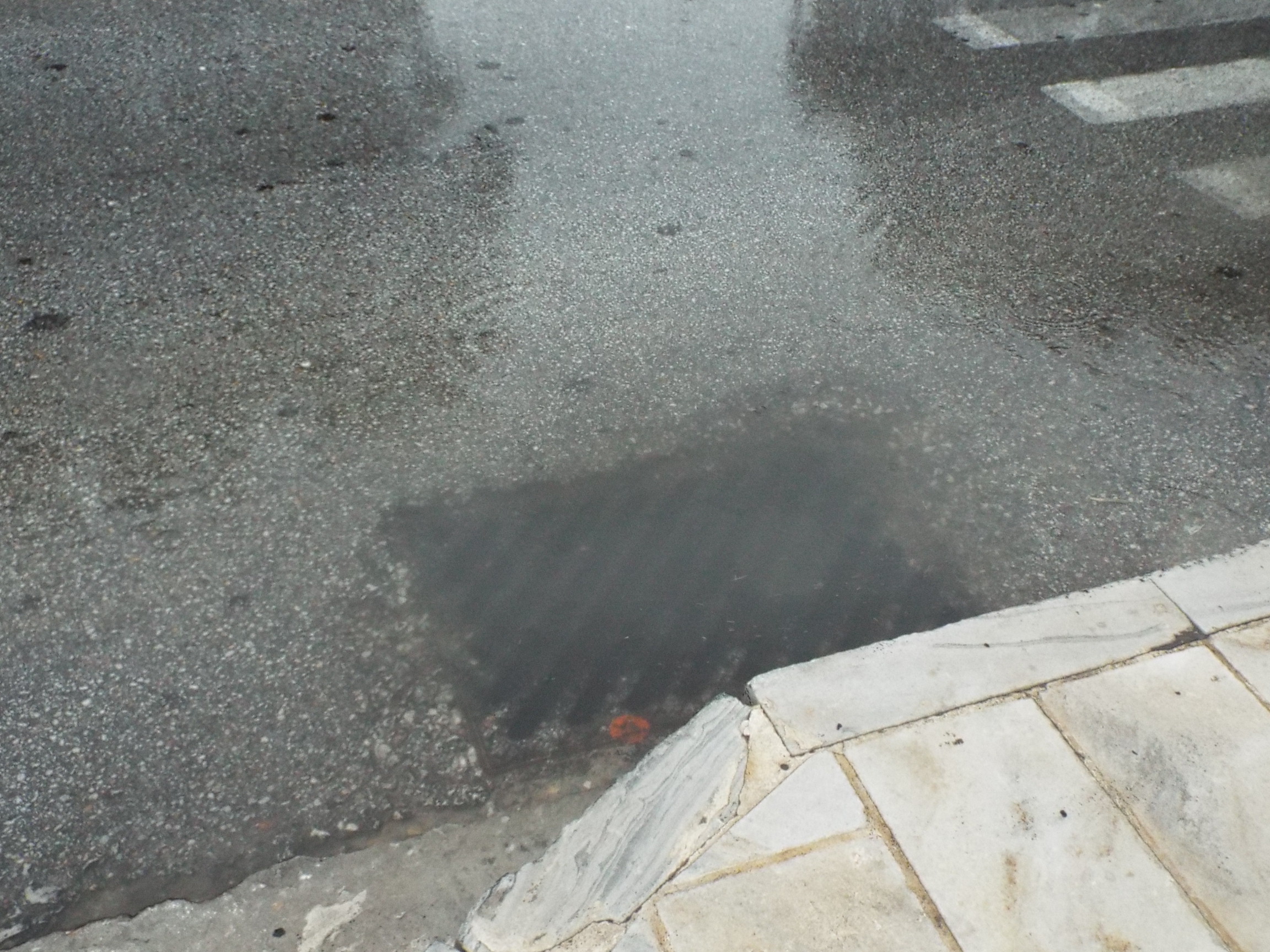 Από το ύψος της Alpha Bank, τα νερά ήδη από το μεσημέρι είχαν σχηματίσει λίμνες, ενώ η διέλευση των οχημάτων σήκωνε... κύμα, ακόμη και στο σημείο που βρίσκεται η στάση του Mini Bus, όπου πολλοί πολίτες περίμεναν υπομονετικά αποτραβηγμένοι στο εσωτερικό του μικρού “πάρκου”, ώστε να μην βρέχονται, όχι από τη βροχή, αλλά από τα... απόνερα των αυτοκινήτων.