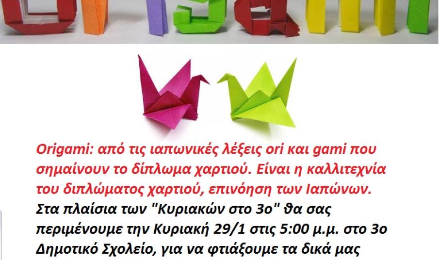 “Με χαρά σας προσκαλούμε την Κυριακή 29 Ιανουαρίου, στις 5 το απόγευμα στο χώρο του 3ου Δημοτικού Σχολείου & Νηπιαγωγείου Ερμούπολης (στο Βροντάδο, Τρεις Ιεράρχες), όπου στο πλαίσιο των δράσεων "Κυριακές στο 3ο", θα πραγματοποιηθεί Εργαστήρι Κατασκευών, με την τεχνική Origami.