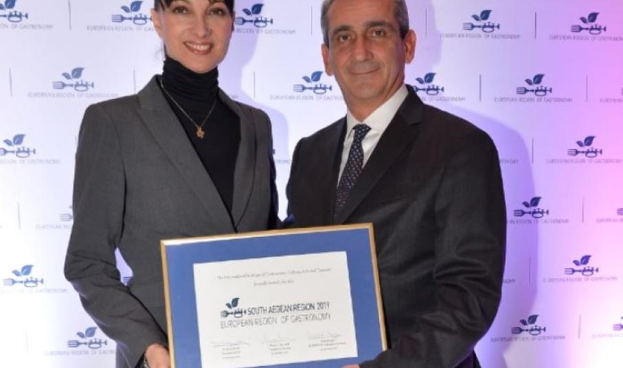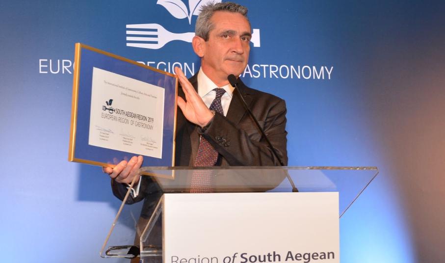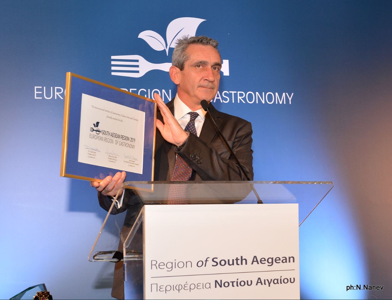 Στην διάρκεια λαμπρής εκδήλωσης στο ξενοδοχείο “Μεγάλη Βρετανία” , στην Αθήνα, έγινε σήμερα η απονομή του τίτλου "European Region of Gastronomy 2019", στην Περιφέρεια Νοτίου Αιγαίου.