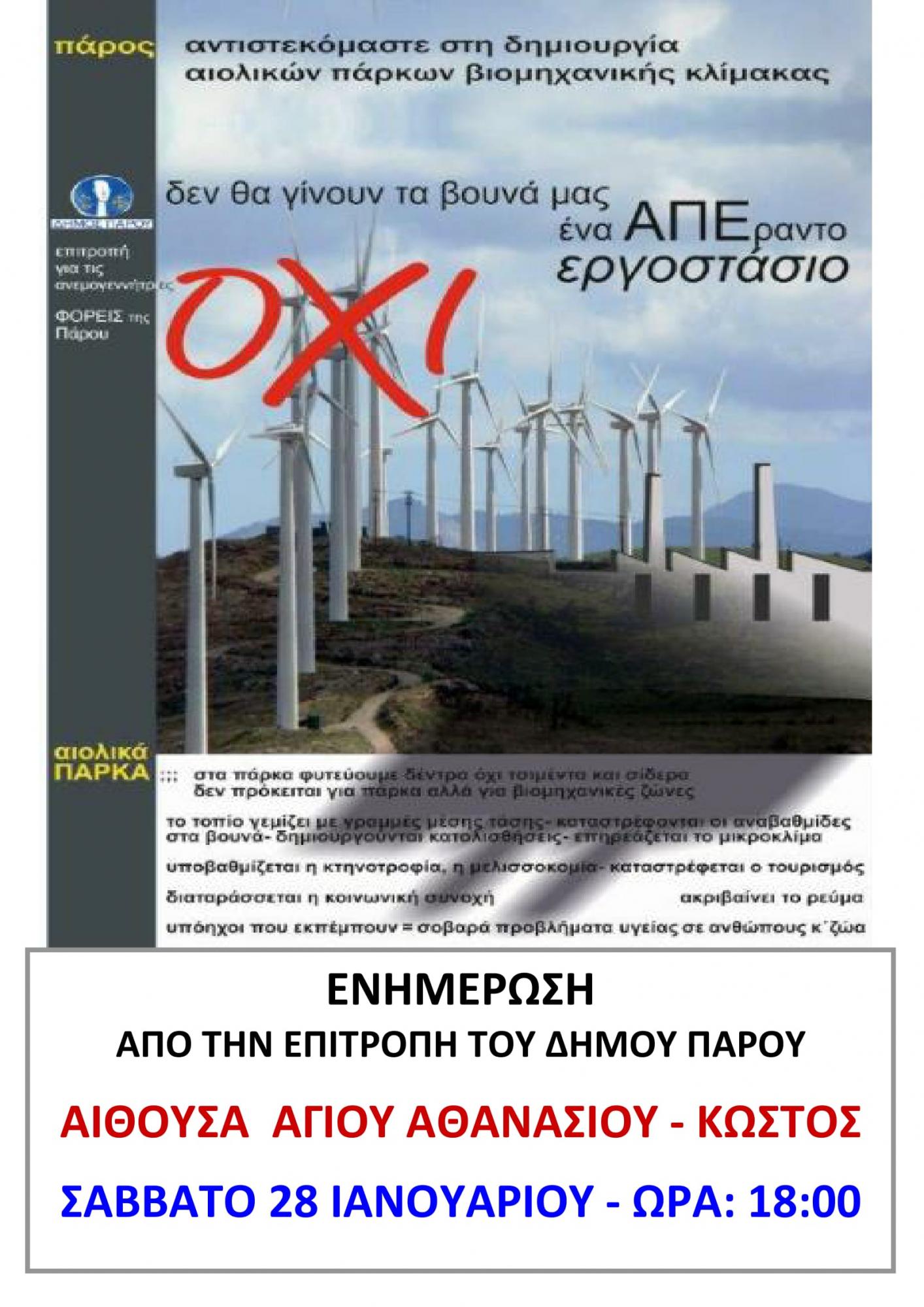 Ενημέρωση για τα "Αιολικά Πάρκα" θα πραγματοποιήσει το Σάββατο 28 Ιανουαρίου και ώρα 18:00 στην Αίθουσα Αγίου Αθανασίου - Κώστος η Επιτροπή του Δήμου Πάρου.