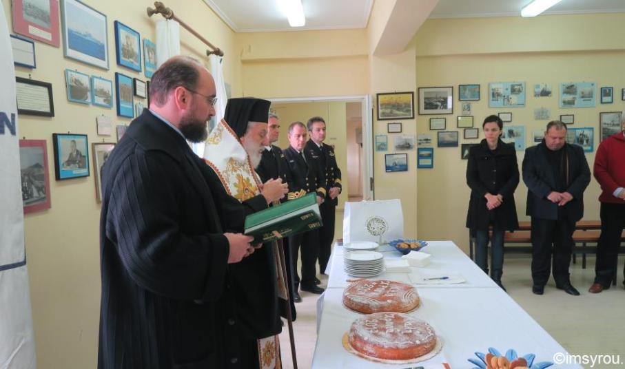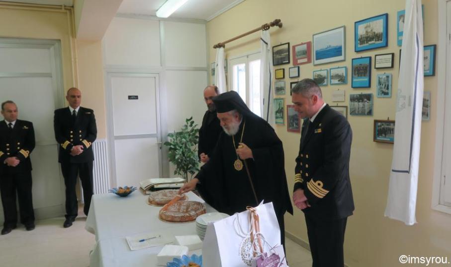 Την Πολεμική Ναυτική Βάση Αγκαθωπών Σύρου, κατόπιν προσκλήσεως του Διοικητού της, επισκέφθηκε σήμερα, όπως ήταν από καιρού προγραμματισμένο, ο Σεβασμιώτατος κ. Δωρόθεος Β΄ και ευλόγησε την πίττα του Αγίου Βασιλείου, παρουσία των Αντιδημάρχων Σύρου-Ερμούπολης κ.κ. Αλεξάνδρου Αθανασίου και Μάριου Βουτσίνου, εκπροσώπου της Περιφέρειας Ν. Αιγαίου, του Διοικητού της 6ης Περιφερειακής Διεύθυνσης Λιμενικού Σώματος. του Υποδιοικητού, των Αξιωματικών και Οπλιτών της Βάσεως.