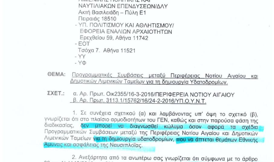 Επειδή το παραπάνω έγγραφο προφανώς δεν ικανοποίησε τον κ. Θεοδωρίδη και την εργώδη προσπάθειά του να ακυρώσει το εγχείρημα, το ΓΕΝ απέστειλε προς την Αποκεντρωμένη Διοίκηση Αιγαίου και δεύτερο έγγραφο, με ημερομηνία 23-6-2016, όπου και πάλι τονίζεται ρητώς ότι το ΓΕΝ δεν έχει καμία αντίρρηση όσον αφορά τις Προγραμματικές Συμβάσεις.