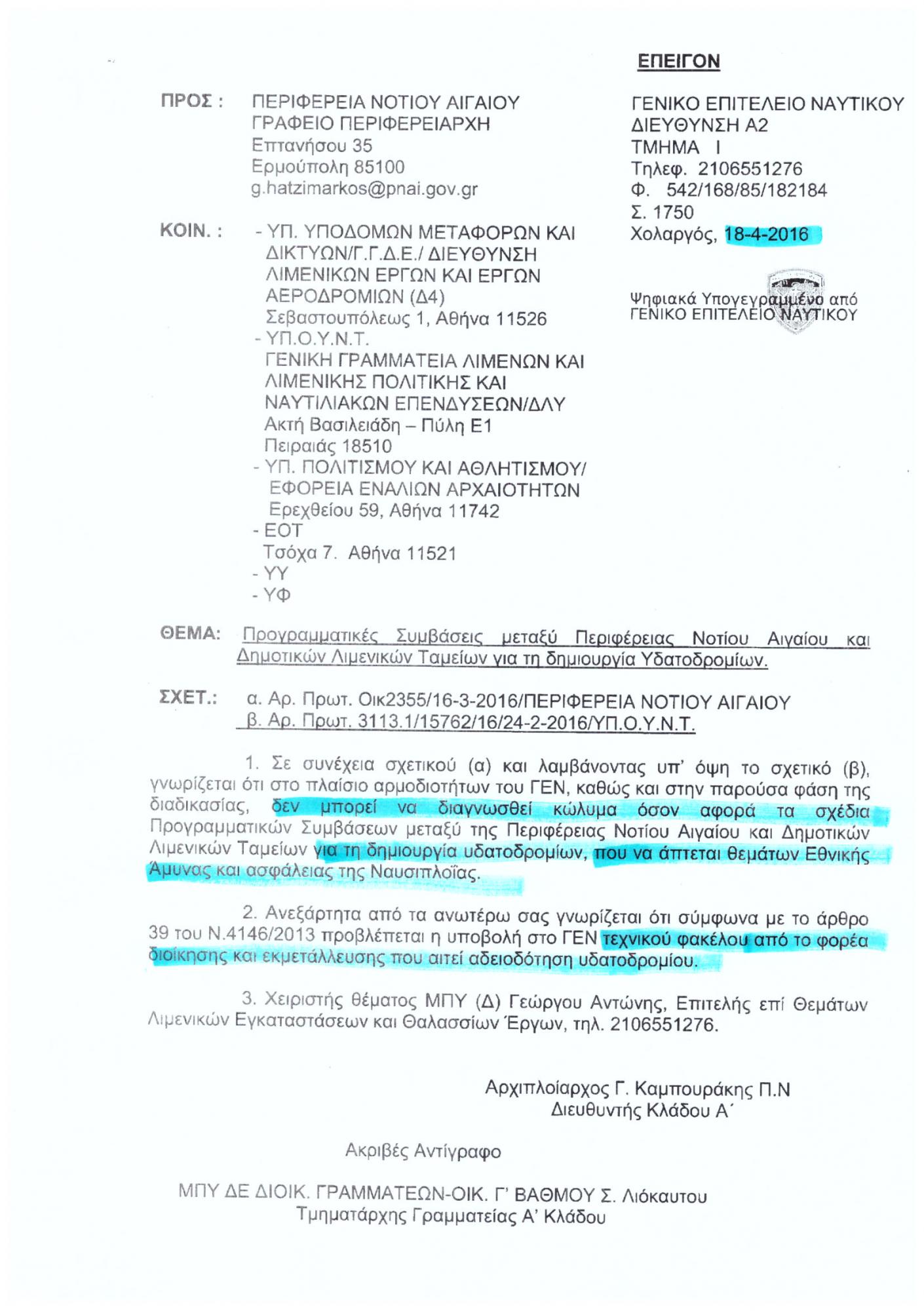 Στο πρώτο έγγραφο, με ημερομηνία 18-04-2016, το ΓΕΝ αναφέρει σαφώς ότι δεν τίθεται κανένα κώλυμα όσον αφορά τα σχέδια των Προγραμματικών Συμβάσεων που να άπτεται θεμάτων Εθνικής Άμυνας και ασφάλειας της Ναυσιπλοΐας.