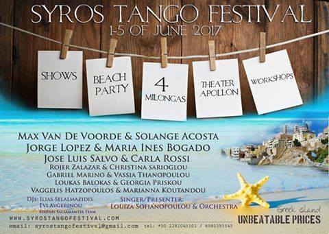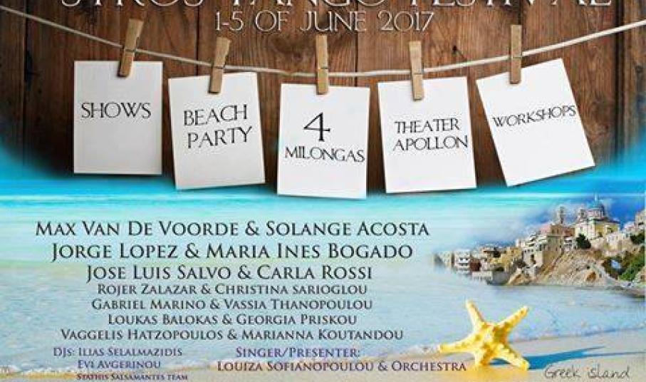 Την αυλαία των μεγάλων διοργανώσεων ανοίγει το 2ο Διεθνές Φεστιβάλ Tango, που θα διεξαχθεί στη Σύρο από 1 έως 5 Ιουνίου 2017. Το φιλότεχνο κοινό θα έχει την ευκαιρία να απολαύσει καταξιωμένα ονόματα της διεθνούς σκηνής όπως οι: Max Van De Voorde & Solange Acosta (Παγκόσμιοι πρωταθλητές 2011), Jorge Lopez & Maria Ines Bogado (Παγκόσμιοι πρωταθλητές 2010), Jose Luis Salvo & Carla Rossi (Metropolitano Champion 2014) και (Rojer Zalazar & Χριστίνα Σαριόγλου (Europeean Champions 2010). Στη διοργάνωση συμμετέχουν επίσης οι: Gabriel Marino & Βάσια Θανοπούλου (πρωταθλητές Ευρώπης 2011), Λουκάς Μπαλόκας & Γεωργία Πρίσκου (International career and owners of Tango FIX dance school) και Βαγγέλης Χατζόπουλος & Μαριάννα Κουτάντου (παγκόσμιοι πρωταθλητές 2013). Τις εκδηλώσεις του φεστιβάλ θα πλαισιώσει η ερμηνεύτρια Λουίζα Σοφιανοπούλου.