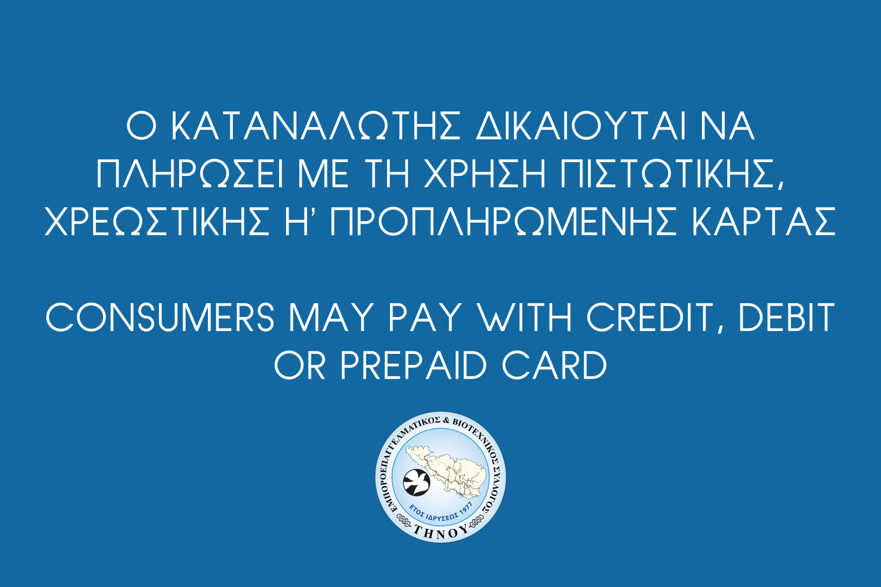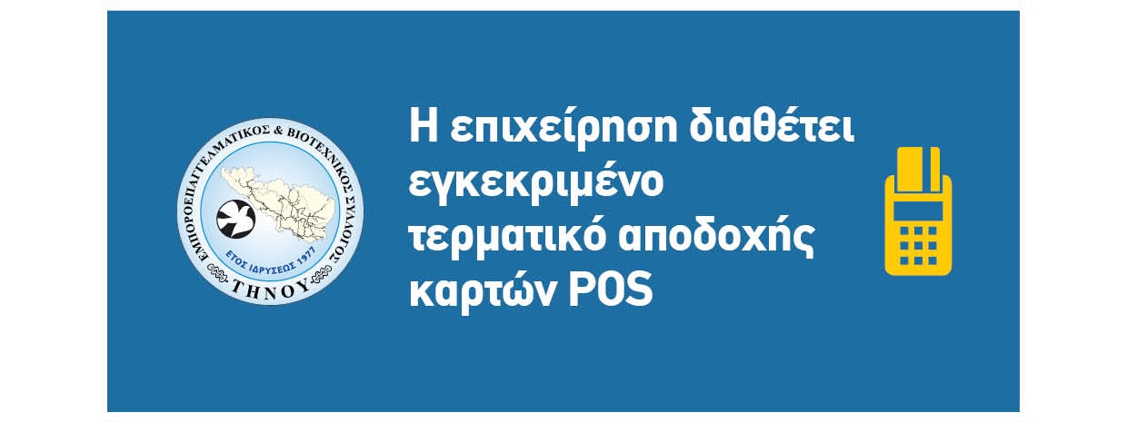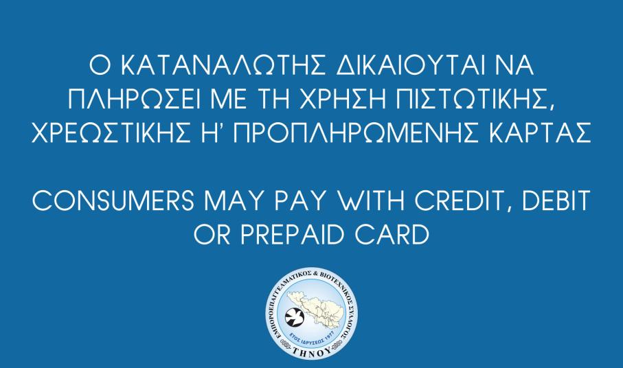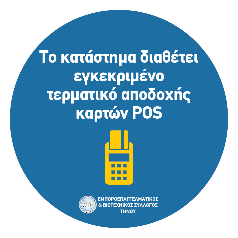 Ο Εμποροεπαγγελματικός & Βιοτεχνικός Σύλλογος Τήνου διέμεινε εχθές στα μέλη του τις απαραίτητες εκ του νόμου αναγραφές για την αποδοχ ή ή μη μέσων πληρωμής με κάρτες πιστωτικές, χρεωστικές κ.τ.λ.