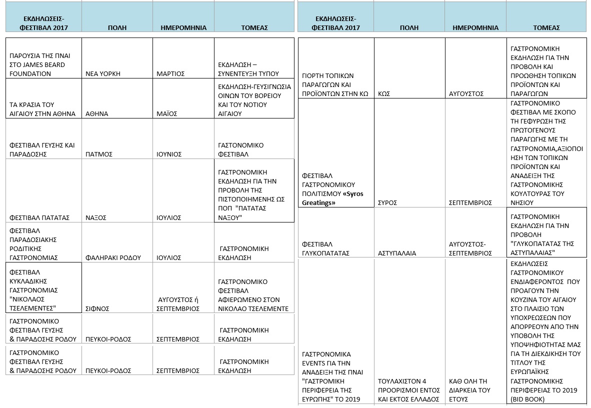 • Διοργάνωση ή/και συνδιοργάνωση γαστρονομικών εκδηλώσεων με φορείς του τουρισμού, του πρωτογενούς τομέα κ.λπ. για την προβολή της αιγαιακής κουζίνας