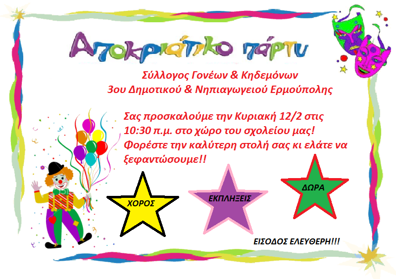 Το 3ο Δημοτικό και Νηπιαγωγείο Ερμούπολης προσκαλεί μικρά και μεγάλα παιδιά του στην αποκριάτικη γιορτή του, την Κυριακή 12 Φεβρουαρίου από τις 10:30 το πρωί στο χώρο του σχολείου.