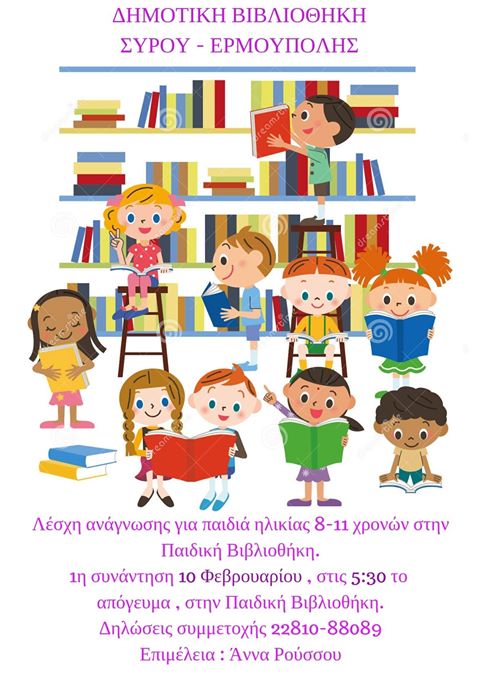 Η πρώτη συνάντηση της Λέσχης Ανάγνωσης για παιδιά ηλικίας 8 – 11 ετών θα πραγματοποιηθεί την Παρασκευή 10 Φεβρουαρίου στις 17:30, στο χώρο της Παιδικής Βιβλιοθήκης.