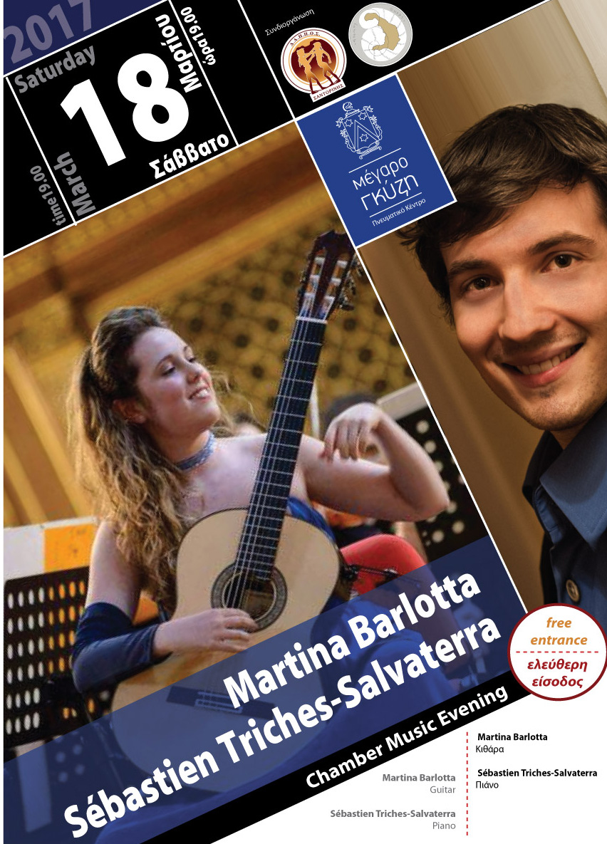 Έργα από το παγκόσμιο ρεπερτόριο της κιθάρας, καθώς και έργα μουσικής δωματίου για κιθάρα και πιάνο με τη σύμπραξη του πιανίστα Sébastien Salvaterra θα παρουσιάσει το Σάββατο 18 Μαρτίου, η κιθαρίστα Martina Barlotta. Η Ιταλίδα καλλιτέχνης εκτιμάται διεθνώς για την εκφραστικότητα και την καλλιτεχνική της παρουσία στις εμφανίσεις της. είναι κάτοχος πολλών πρώτων βραβείων σε Διεθνής Διαγωνισμούς Κιθάρας. Το Μάιο του 2015 κέρδισε μία από τις τέσσερις διεθνείς υποτροφίες "Claudio Abbado” που προσφέρονται με σκοπό να ενισχύσουν νέους με υψηλό καλλιτεχνικό επίπεδο.