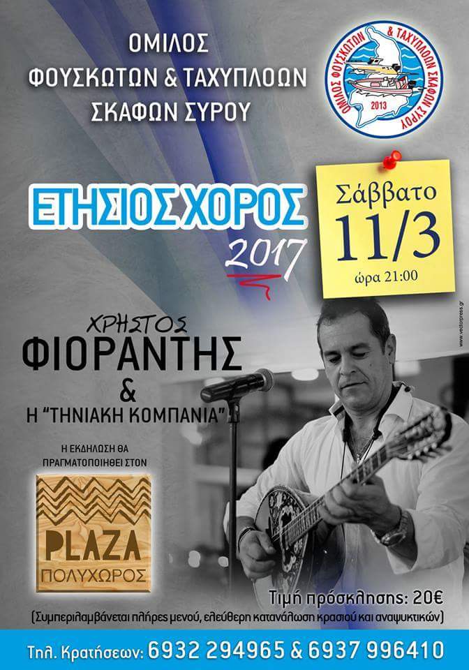 Ο Όμιλος Φουσκωτών και Ταχυπλόων Σκαφών Σύρου πραγματοποιεί τον Ετήσιο Χορό του, το Σάββατο 11 Μαρτίου και ώρα 21:00 στον Πολυχώρο Plaza.