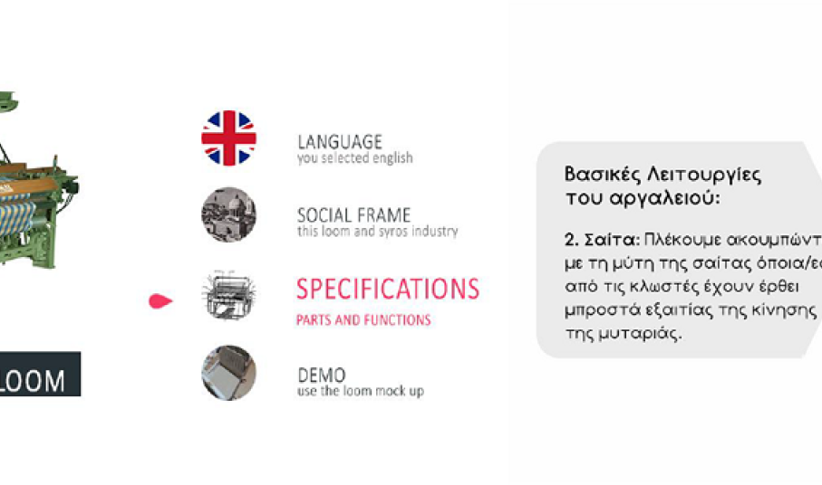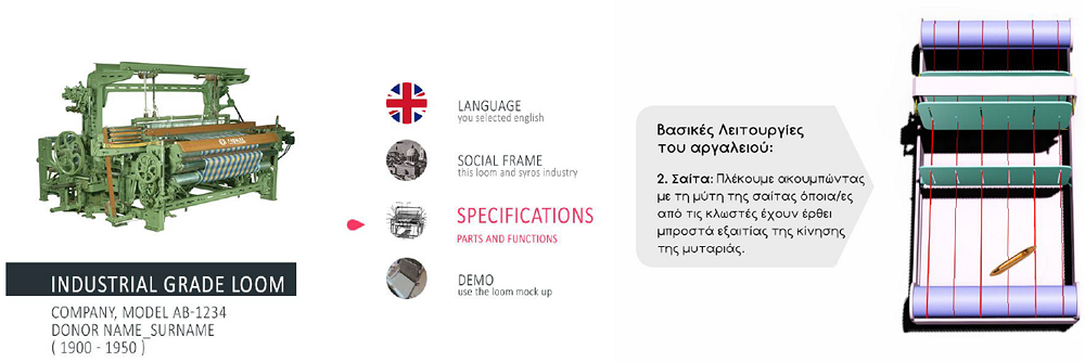 Το σύστημα «Loom» απαρτίζεται από μια πρωτότυπη μακέτα αργαλειού συνδεδεμένη με μια οθόνη αφής στην οποία προβάλλεται ένας εικονικός αργαλειός- αντίστοιχος της μακέτας. Το σύστημα προσκαλεί τον χρήστη να υφάνει σ αυτόν, χρησιμοποιώντας σαν “ποντίκι και πληκτρολόγιο” (διεπαφή) την πρωτότυπη μακέτα. Ο επισκέπτης μπαίνει στη διαδικασία να υφάνει και αποκτά μια ιδέα για τον τρόπο λειτουργίας του πραγματικού αργαλειού. Οι τεχνολογίες που χρησιμοποιήθηκαν ήταν το περιβάλλον ανάπτυξης λογισμικού Unity, η πλατφόρμα ψηφιακών κυκλωμάτων Arduino και τα περιβάλλοντα τρισδιάστατης μοντελοποίησης 3ds Max&Creoparametric.