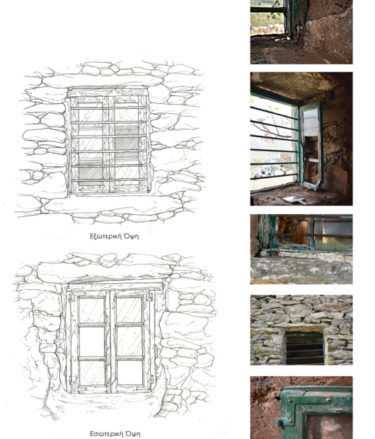 Το άνοιγμα του παραθύρου στον τοίχο διαμορφώνεται με ένα πέτρινο πρέκι, του οποίου το φορτίο ελαφρύνεται μέσω του παρακάτω ανακουφιστικού συστήματος. Στις άκρες του λίθου του πρεκιού εδράζονται δύο πέτρες, οι οποίες ονομάζονται σταυροφώλια, ενώ πάνω σε αυτές, κεντρικά εδράζεται ο λεγόμενος ζυγός. Με αυτή τη διαμόρφωση, τα κατακόρυφα φορτία του βάρους τα υπερκείμενης λιθοδομής μεταφέρονται από το ζυγό, στα σταυροφώλια, στις άκρες του πρεκιού, και τελικώς στην υπόλοιπη λιθοδομή, χωρίς να επιβαρυνθεί η μέση του πρεκιού, που είναι το πιο ευαίσθητο σε κάμψη στοιχείο. Ενώ το παράθυρο υπήρχε εξαρχής στην κατασκευή της καθοικιάς, το κούφωμα θεωρείται πως μπήκε αργότερα αφού διαθέτει γυαλί. Το κούφωμα είναι ξύλινο, ανοιγόμενο, με δύο φύλλα, βαμμένο σε πράσινο χώμα. Δε διαθέτει σκούρα, αλλά έχει μια σιδεριά εξωτερικά, από οριζόντιες, κυκλικής διατομής ράβδους, που εισέρχονται στον τοίχο. Η κάσα του κουφώματος διαμορφώνεται από τα οριζόντια ξύλα που εισέρχονται επίσης στον τοίχο, στα οποία στερεώνονται με μόρσα τα κατακόρυφα στοιχεία της. Εξαιτίας του δομικού αυτού συστήματός της, απομένει ένα μικρό κενό μεταξύ του πρεκιού της λιθοδομής και του πανωκασιού, το οποίο συμπληρώνεται με σοβά. Κλειδώνει με ένα απλό σύστημα από μεταλλικά εξαρτήματα, ένα στο φύλλο του κουφώματος που περιστρέφεται και ένα στην κάσα, που είναι υποδοχή για το πρώτο.